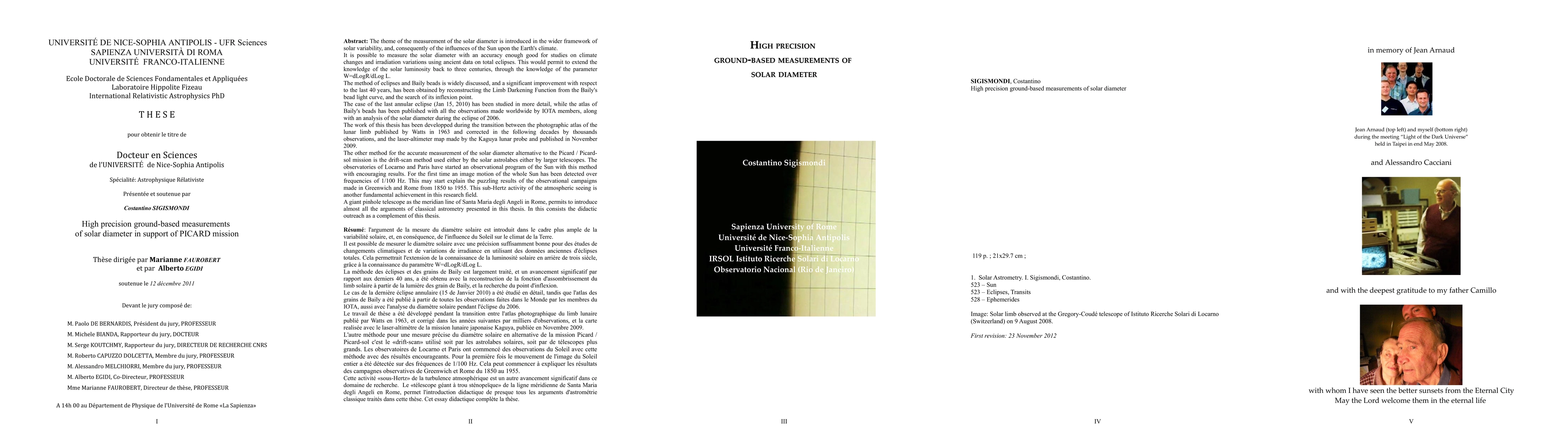The measurement of the solar diameter is introduced in the wider framework of solar variability and of the influences of the Sun upon the Earth's climate. Ancient eclipses and planetary transits would permit to extend the knowledge of the solar irradiance back to three centuries, through the parameter W=dLogR/dLogL. The method of Baily's beads timing during eclipses is discussed, and a significant improvement with respect to the last 40 years has been obtained by reconstructing the Limb Darkening Function's inflexion point from their light curve and the corresponding lunar valleys' profiles. The case of the Jan 15, 2010 annular eclipse has been studied in detail, as well as the last two transits of Venus. The atlas of Baily's beads, realized with worldwide contributions by IOTA members is presented along with the solar diameter during the eclipse of 2006. The transition between the photographic atlas of the lunar limb (Watts, 1963) and the laser-altimeter map made by the Kaguya lunar probe in 2009 has been followed. The other method for the accurate measurement of the solar diameter alternative to the PICARD / PICARD-sol mission is the drift-scan method used either by the solar astrolabes either by larger telescopes. The observatories of Locarno and Paris have started an observational program of the Sun with this method with encouraging results. For the first time an image motion of the whole Sun has been detected at frequencies of 1/100 Hz. This may start explain the puzzling results of the observational campaigns made in Greenwich and Rome from 1850 to 1955. The meridian line of Santa Maria degli Angeli in Rome is a giant pinhole telescope and it permits to introduce didactically almost all the arguments of classical astrometry here presented. The support to the PICARD mission continues with the analyses of the transit of Venus and the total eclipse of 2012.
