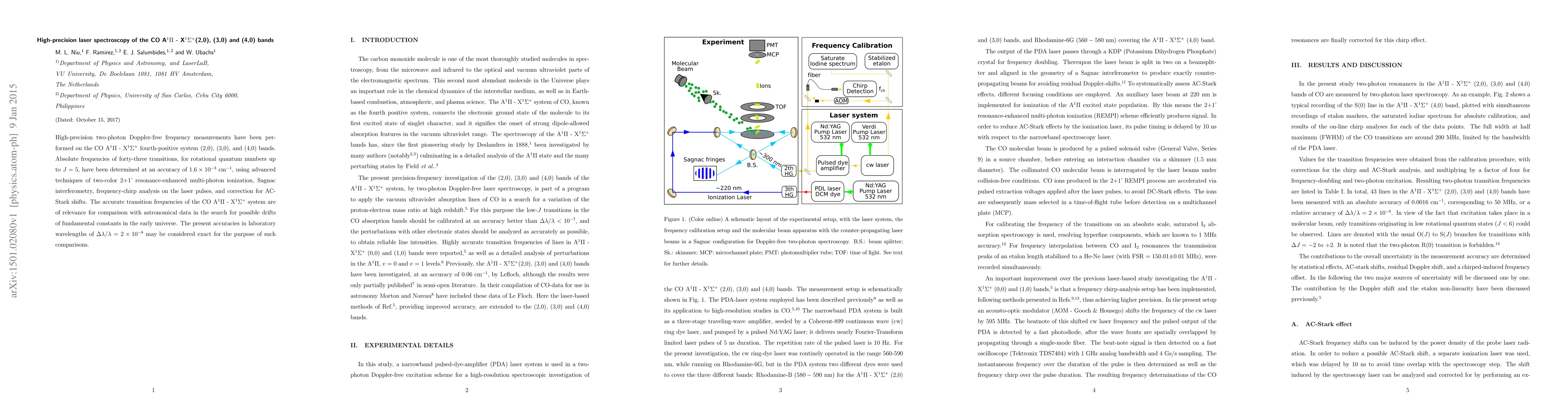 This paper reports high-precision laser spectroscopy measurements of CO A$^1\Pi$ - X$^1\Sigma^+$ bands, determining the absolute frequencies of 43 transitions with an accuracy of $1.6\times10^{-3}$ cm$^{-1}$. These accurate frequencies are crucial for comparing with astronomical data to investigate potential fundamental constant drifts in the early universe.