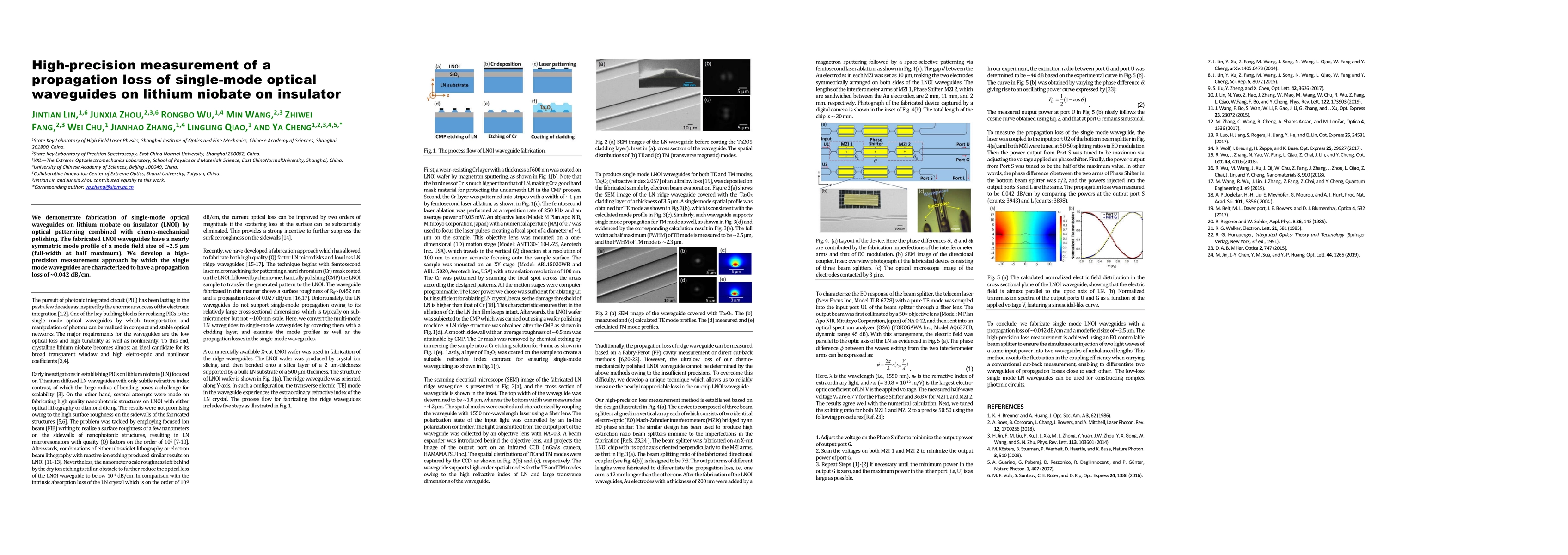 This paper details the fabrication of single-mode optical waveguides on lithium niobate on insulator (LNOI) using optical patterning and chemo-mechanical polishing. The study reports a high-precision measurement technique, revealing a low propagation loss of approximately 0.042 dB/cm for these waveguides.