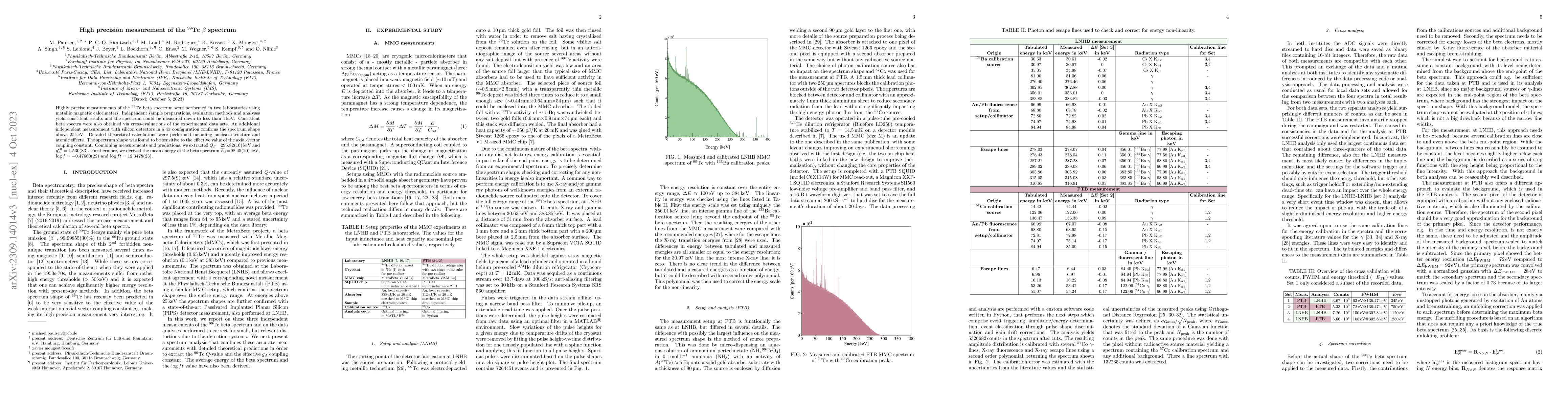 This study reports highly precise measurements of the $^{99}$Tc beta spectrum using metallic magnetic calorimeters and silicon detectors, yielding consistent results down to less than 1 keV. The extracted values for the effective axial-vector coupling constant and beta decay parameters provide insights into nuclear structure and atomic effects.