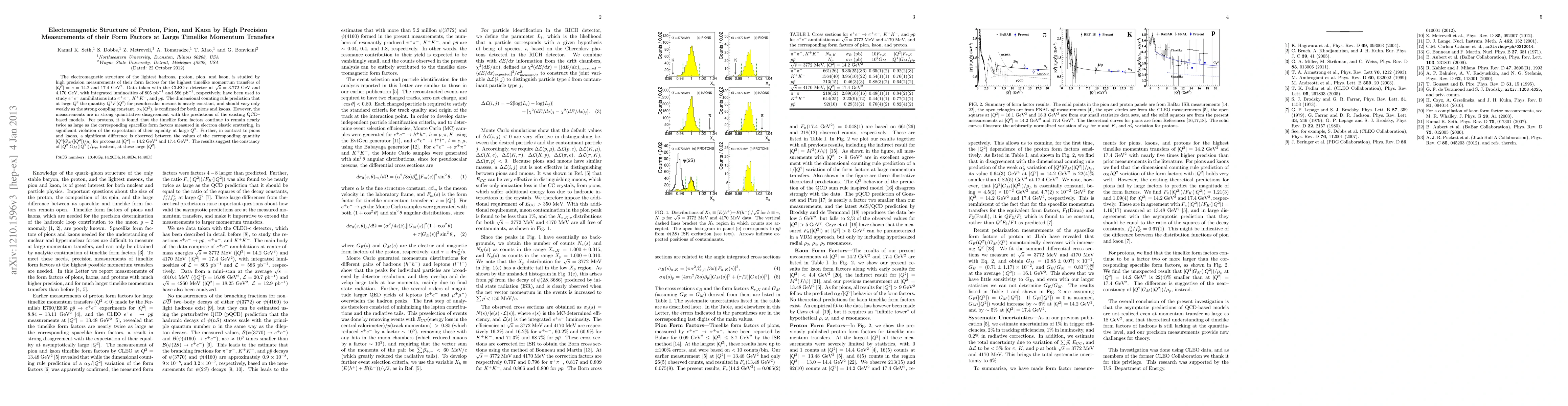 This study reports high precision measurements of the form factors for pions, kaons, and protons at large timelike momentum transfers using data from the CLEO-c detector. The results confirm the perturbative QCD prediction for pions and kaons but reveal a significant deviation for protons, suggesting the constancy of |Q^2|G_M(|Q^2|)/mu_p for protons instead of the expected near-constant quantity.