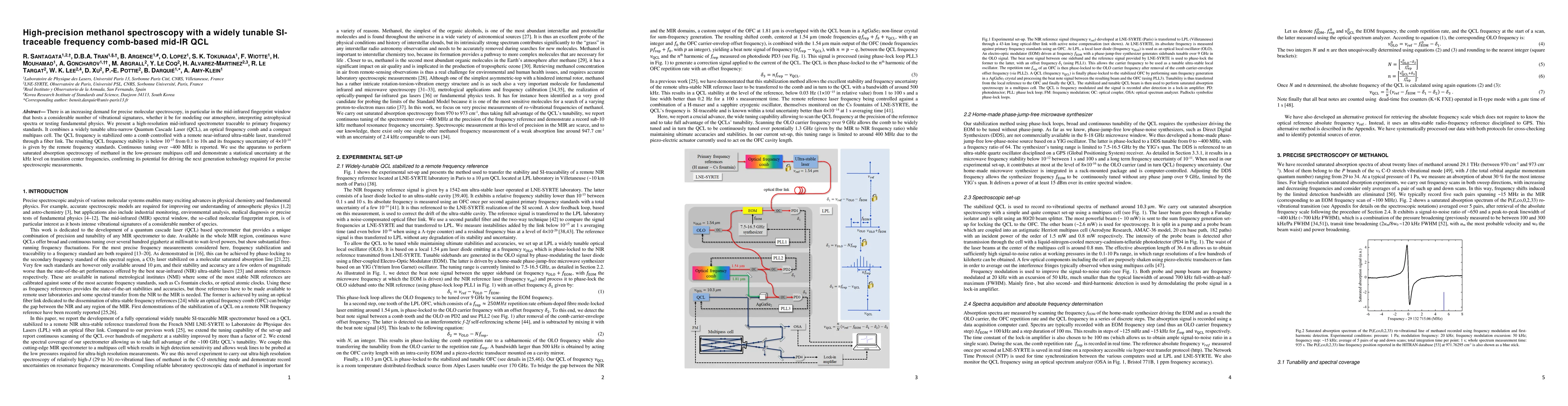 There is an increasing demand for precise molecular spectroscopy, in particular in the mid-infrared fingerprint window that hosts a considerable number of vibrational signatures, whether it be for modeling our atmosphere, interpreting astrophysical spectra or testing fundamental physics. We present a high-resolution mid-infrared spectrometer traceable to primary frequency standards. It combines a widely tunable ultra-narrow Quantum Cascade Laser (QCL), an optical frequency comb and a compact multipass cell. The QCL frequency is stabilized onto a comb controlled with a remote near-infrared ultra-stable laser, transferred through a fiber link. The resulting QCL frequency stability is below 10-15 from 0.1 to 10s and its frequency uncertainty of 4x10-14 is given by the remote frequency standards. Continuous tuning over ~400 MHz is reported. We use the apparatus to perform saturated absorption spectroscopy of methanol in the low-pressure multipass cell and demonstrate a statistical uncertainty at the kHz level on transition center frequencies, confirming its potential for driving the next generation technology required for precise spectroscopic measurements.