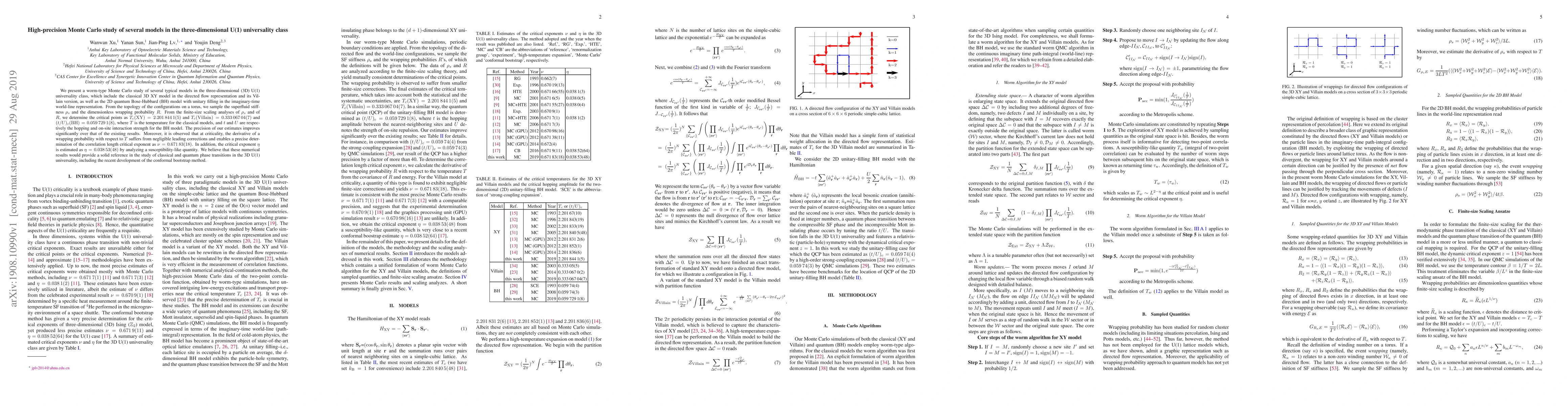 This study uses a high-precision Monte Carlo method to determine critical points for classical 3D XY and Villain models, as well as the 2D quantum Bose-Hubbard model within the 3D U(1) universality class. The research refines existing estimates and identifies the correlation length exponent as u03bd=0.671u00b10.018, alongside an estimation of the critical exponent u03c7 as 0.038u00b10.005. These findings enhance understanding of phase transitions in the 3D U(1) universality class, offering valuable references for both classical and quantum phase transition studies.