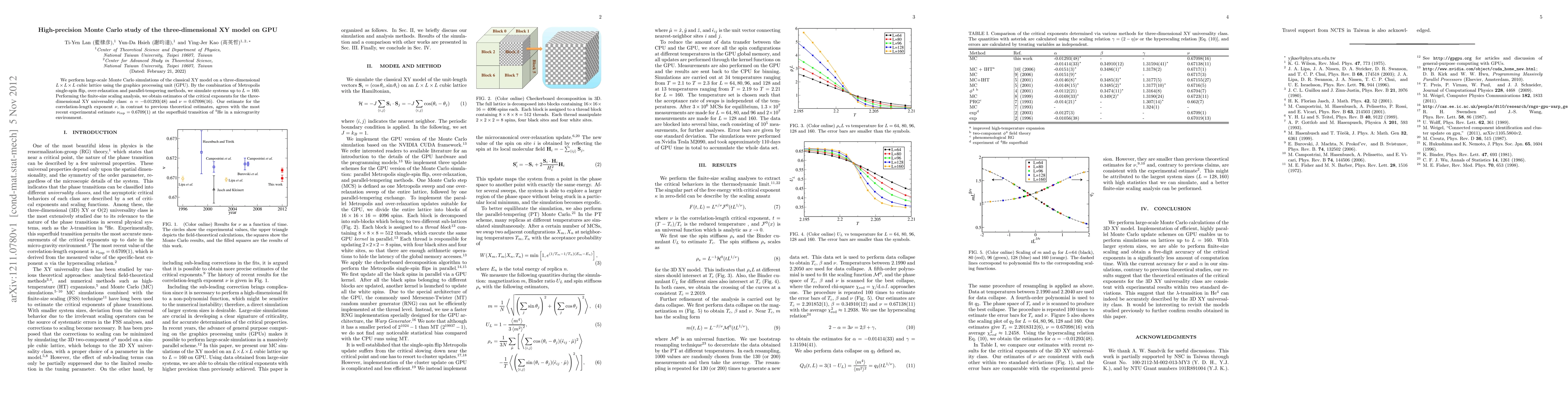 This paper presents high-precision Monte Carlo simulations of the three-dimensional XY model on a GPU, employing Metropolis, over-relaxation, and parallel-tempering methods. The study estimates the critical exponents $\alpha$ and $\nu$, with $\nu$ matching recent experimental findings for the superfluid transition in $^4$He.