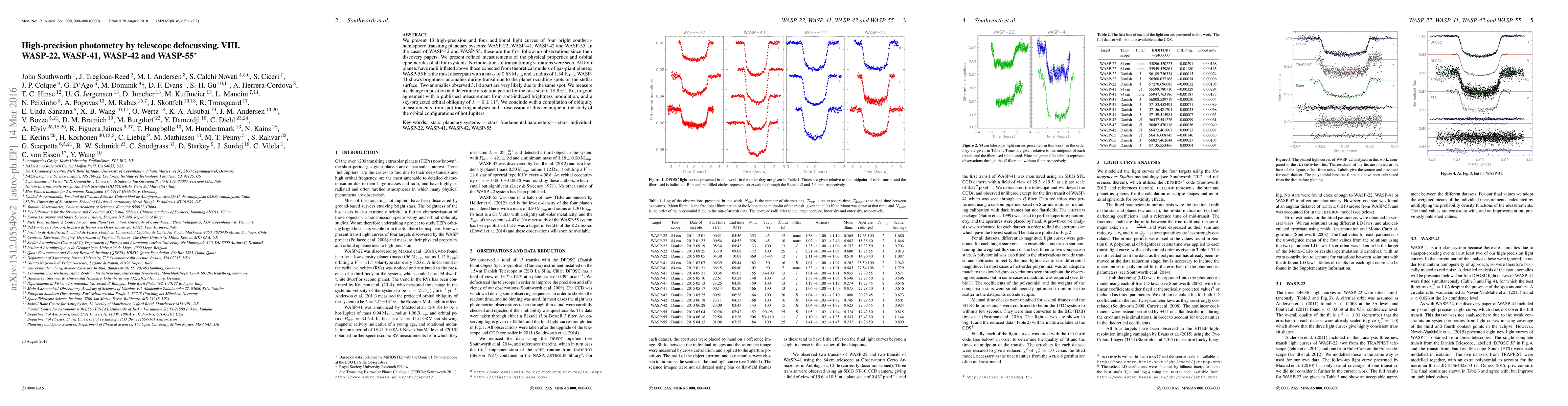 The paper presents high-precision photometry of four southern-hemisphere transiting planetary systems, revealing inflated radii for all planets except WASP-55b, with unusual characteristics and spot-induced brightness anomalies in one system.