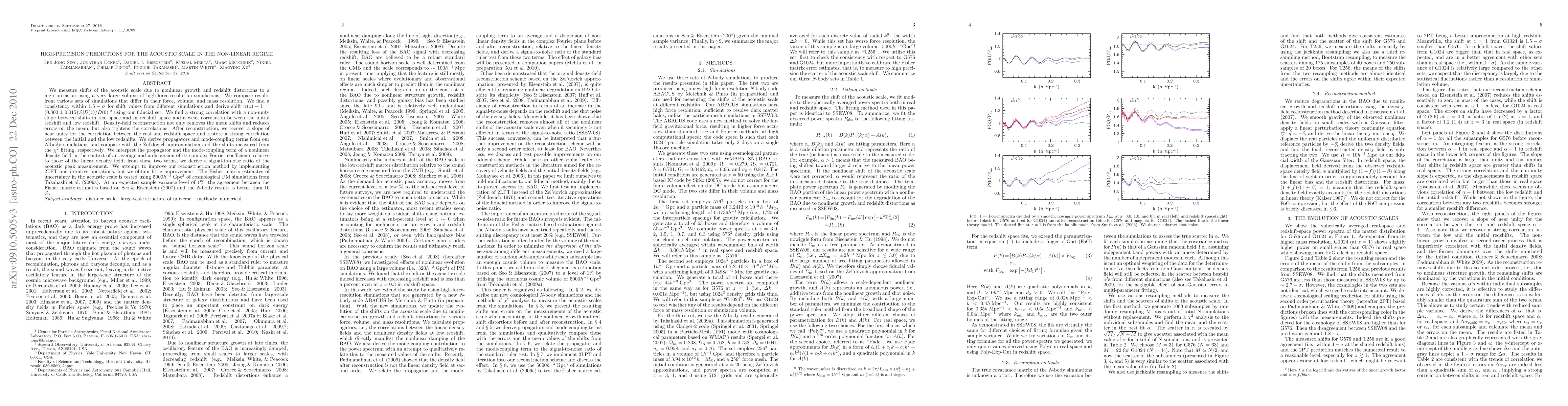 We measure shifts of the acoustic scale due to nonlinear growth and redshift distortions to a high precision using a very large volume of high-force-resolution simulations. We compare results from various sets of simulations that differ in their force, volume, and mass resolution. We find a consistency within 1.5-sigma for shift values from different simulations and derive shift alpha(z) -1 = (0.300\pm 0.015)% [D(z)/D(0)]^{2} using our fiducial set. We find a strong correlation with a non-unity slope between shifts in real space and in redshift space and a weak correlation between the initial redshift and low redshift. Density-field reconstruction not only removes the mean shifts and reduces errors on the mean, but also tightens the correlations: after reconstruction, we recover a slope of near unity for the correlation between the real and redshift space and restore a strong correlation between the low and the initial redshifts. We derive propagators and mode-coupling terms from our N-body simulations and compared with Zeldovich approximation and the shifts measured from the chi^2 fitting, respectively. We interpret the propagator and the mode-coupling term of a nonlinear density field in the context of an average and a dispersion of its complex Fourier coefficients relative to those of the linear density field; from these two terms, we derive a signal-to-noise ratio of the acoustic peak measurement. We attempt to improve our reconstruction method by implementing 2LPT and iterative operations: we obtain little improvement. The Fisher matrix estimates of uncertainty in the acoustic scale is tested using 5000 (Gpc/h)^3 of cosmological PM simulations from Takahashi et al. (2009). (abridged)