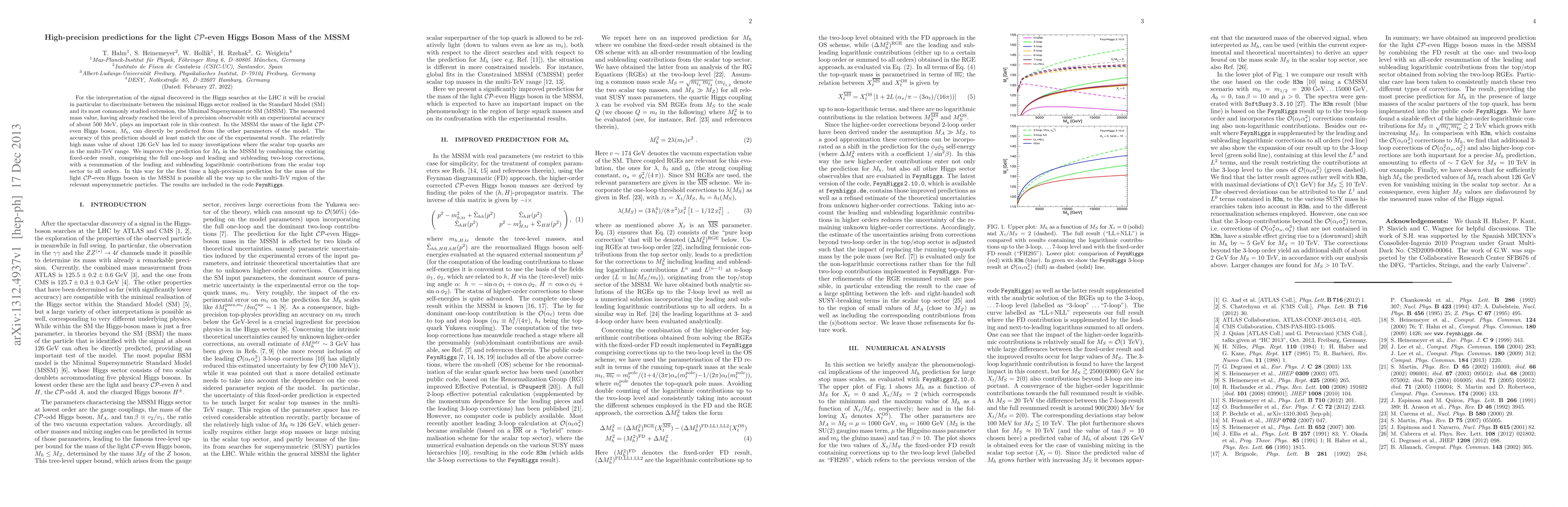 This paper presents a high-precision prediction for the mass of the light CP-even Higgs boson (M_h) in the Minimal Supersymmetric Standard Model (MSSM), combining fixed-order calculations with resummation of logarithmic contributions from the scalar top sector. The improved prediction matches the experimental accuracy and extends to the multi-TeV range of supersymmetric particles.