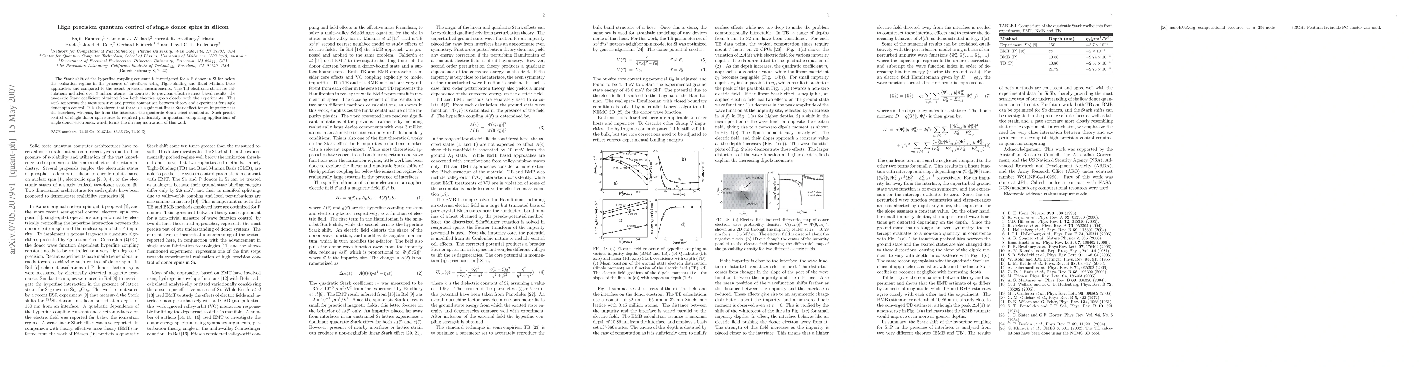 The Stark shift of the hyperfine coupling constant is investigated for a P donor in Si far below the ionization regime in the presence of interfaces using Tight-binding and Band Minima Basis approaches and compared to the recent precision measurements. The TB electronic structure calculations included over 3 million atoms. In contrast to previous effective mass based results, the quadratic Stark coefficient obtained from both theories agrees closely with the experiments. This work represents the most sensitive and precise comparison between theory and experiment for single donor spin control. It is also shown that there is a significant linear Stark effect for an impurity near the interface, whereas, far from the interface, the quadratic Stark effect dominates. Such precise control of single donor spin states is required particularly in quantum computing applications of single donor electronics, which forms the driving motivation of this work.