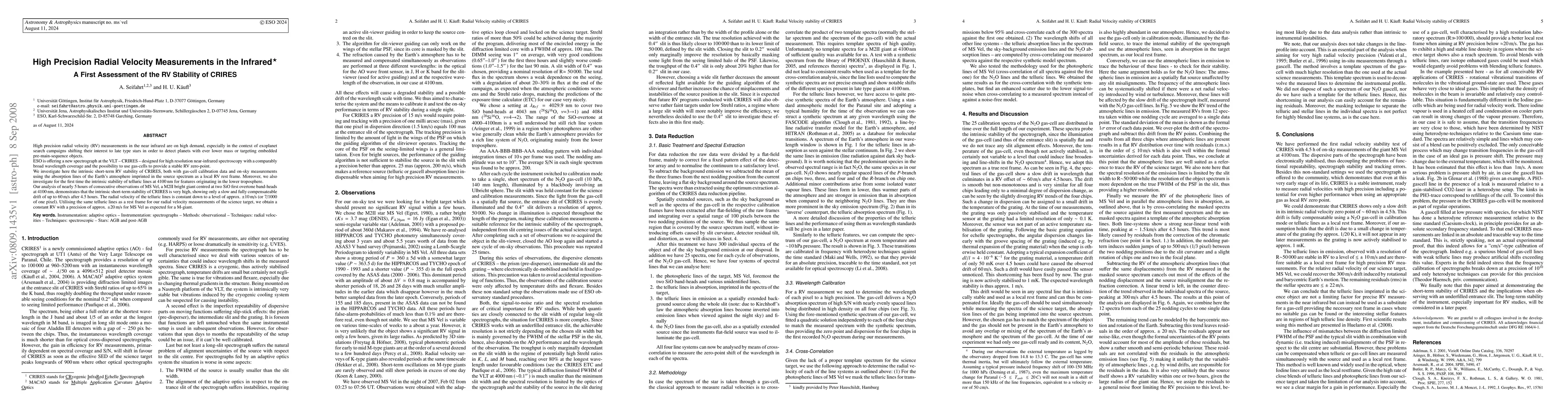 This paper assesses the intrinsic short-term radial velocity (RV) stability of CRIRES, a high-resolution near-infrared spectrograph on the VLT, finding it to be very high with a drift of up to 60 m/s over 4.5 hours. The study also confirms the stability of telluric lines at 4100 nm, achieving a precision of +/- 20 m/s for the science target MS Vel.
