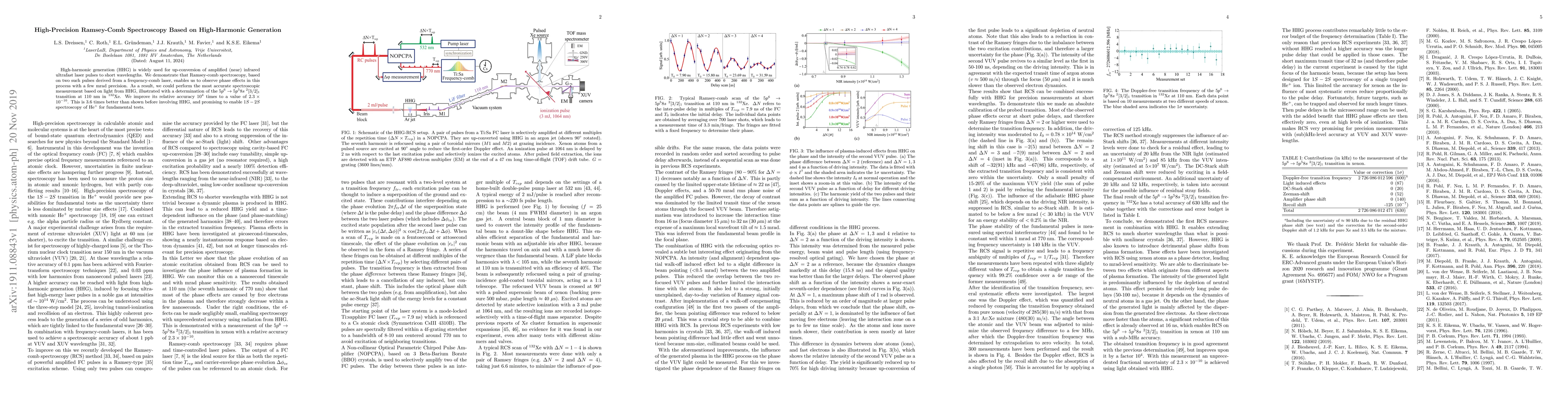 High-harmonic generation (HHG) is widely used for up-conversion of amplified (near) infrared ultrafast laser pulses to short wavelengths. We demonstrate that Ramsey-comb spectroscopy, based on two such pulses derived from a frequency-comb laser, enables us to observe phase effects in this process with a few mrad precision. As a result, we could perform the most accurate spectroscopic measurement based on light from HHG, illustrated with a determination of the $5p^6 \rightarrow 5p^5 8s~^2[3/2]_1$ transition at 110 nm in $^{132}$Xe. We improve its relative accuracy $10^4$ times to a value of $2.3\times10^{-10}$. This is 3.6 times better than shown before involving HHG, and promising to enable $1S-2S$ spectroscopy of He$^+$ for fundamental tests.