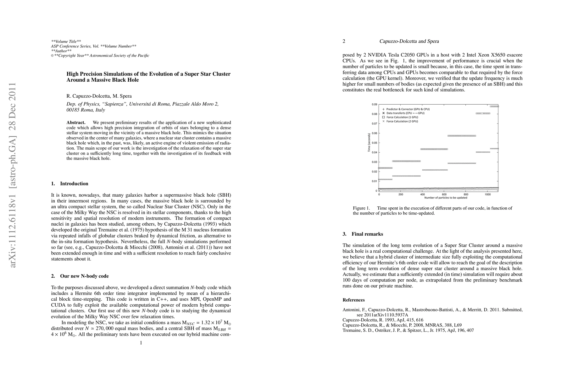 We present preliminary results of the application of a new sophisticated code which allows high precision integration of orbits of stars belonging to a dense stellar system moving in the vicinity of a massive black hole. This mimics the situation observed in the center of many galaxies, where a nuclear star cluster contains a massive black hole which, in the past, was, likely, an active engine of violent emission of radiation. The main scope of our work is the investigation of the relaxation of the super star cluster on a sufficiently long time, together with the investigation of its feedback with the massive black hole.