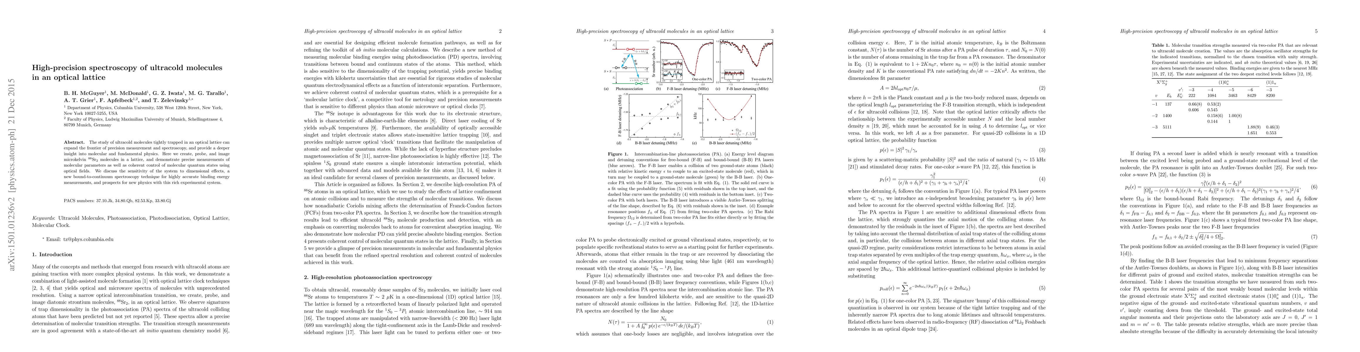 This paper reports on high-precision spectroscopy of ultracold $^{88}$Sr$_2$ molecules in an optical lattice, achieving precise measurements of molecular parameters and demonstrating coherent control of quantum states. The study introduces a novel bound-to-continuum technique for accurate binding energy measurements and explores the potential for new physics discoveries.