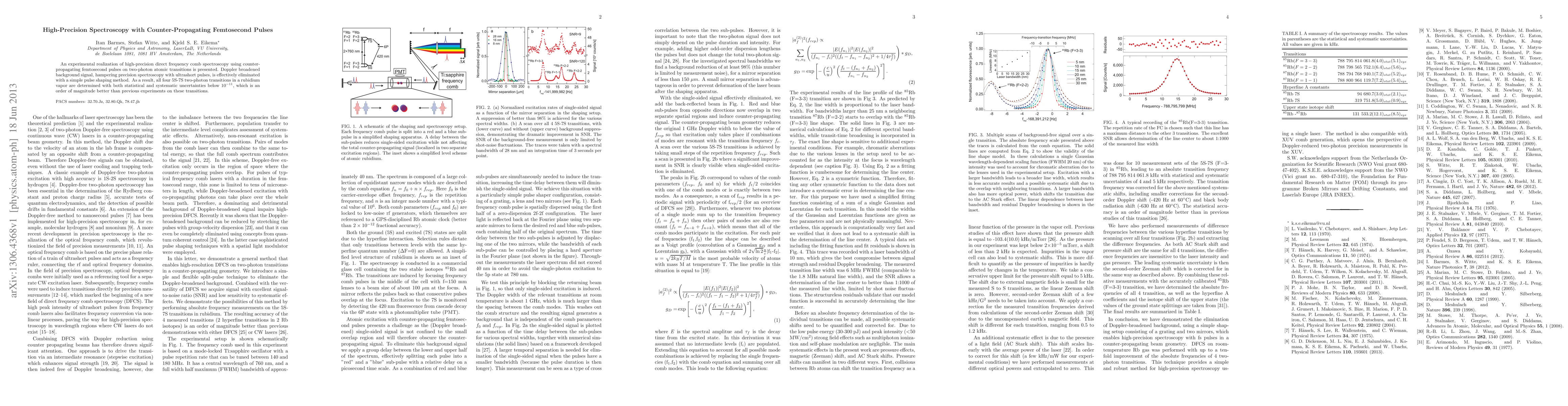 This paper presents high-precision spectroscopy using counter-propagating femtosecond pulses, achieving an order of magnitude improvement in precision over previous methods, by eliminating Doppler broadening and determining rubidium vapor transitions with uncertainties below 10$^{-11}$.