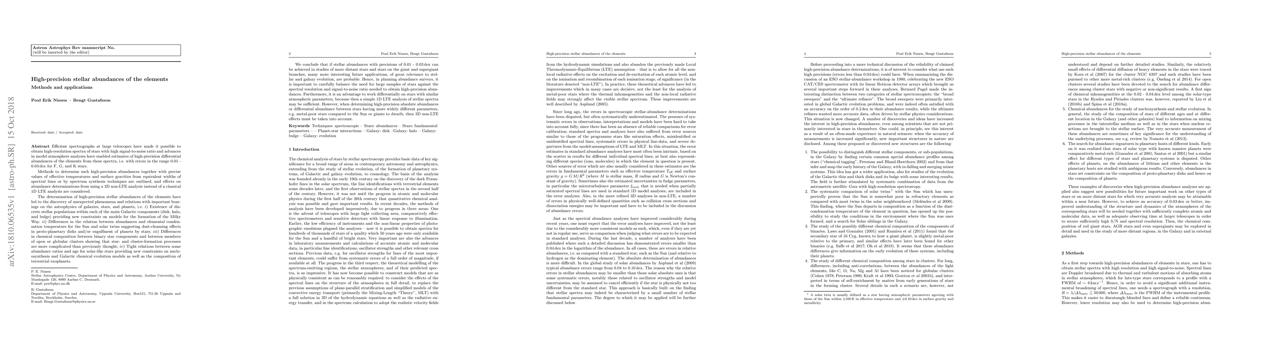 Methods to determine abundances of the elements in the atmospheres of F, G, and K stars with precisions of 0.01-0.03 dex are reviewed. Such high-precision stellar abundances have led to the discovery of unexpected phenomena and relations with important bearings on the astrophysics of galaxies, stars, and planets, such as existence of discrete stellar populations in the Galactic disk and halo, differences in the relation between abundances and elemental condensation temperature for the Sun and solar twins, differences in chemical composition between binary star components and between members of star clusters, and tight relations between some abundance ratios and age for solar-like stars. We conclude that if high-precision abundances can be achieved in studies of more distant stars and stars on the giant and supergiant branches, many more interesting future applications, of great relevance to stellar and galaxy evolution, will be possible. Hence, in planning abundance surveys, it is important to carefully balance the need for large samples of stars against the spectral resolution and signal-to-noise ratio needed to obtain high-precision abundances. Furthermore, it is an advantage to work differentially on stars with similar atmospheric parameters, because then a simple 1D LTE analysis of stellar spectra may be sufficient. However, when determining high-precision absolute abundances or differential abundances between stars having more widely different parameters, e.g. metal-poor stars compared to the Sun or giants to dwarfs, then 3D non-LTE effects must be taken into account.