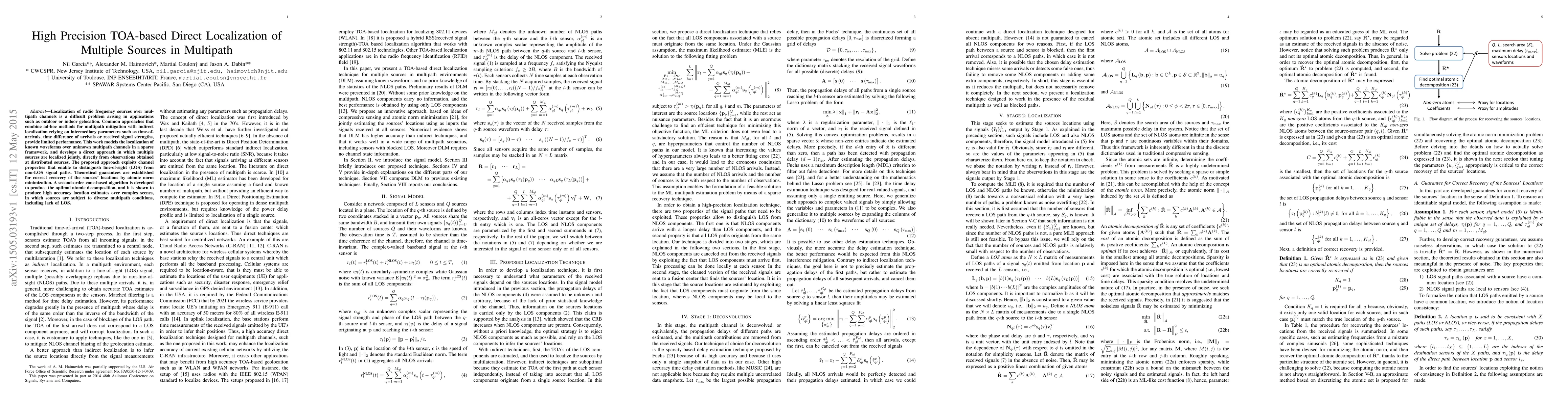 Localization of radio frequency sources over multipath channels is a difficult problem arising in applications such as outdoor or indoor gelocation. Common approaches that combine ad-hoc methods for multipath mitigation with indirect localization relying on intermediary parameters such as time-of-arrivals, time difference of arrivals or received signal strengths, provide limited performance. This work models the localization of known waveforms over unknown multipath channels in a sparse framework, and develops a direct approach in which multiple sources are localized jointly, directly from observations obtained at distributed sources. The proposed approach exploits channel properties that enable to distinguish line-of-sight (LOS) from non-LOS signal paths. Theoretical guarantees are established for correct recovery of the sources' locations by atomic norm minimization. A second-order cone-based algorithm is developed to produce the optimal atomic decomposition, and it is shown to produce high accuracy location estimates over complex scenes, in which sources are subject to diverse multipath conditions, including lack of LOS.