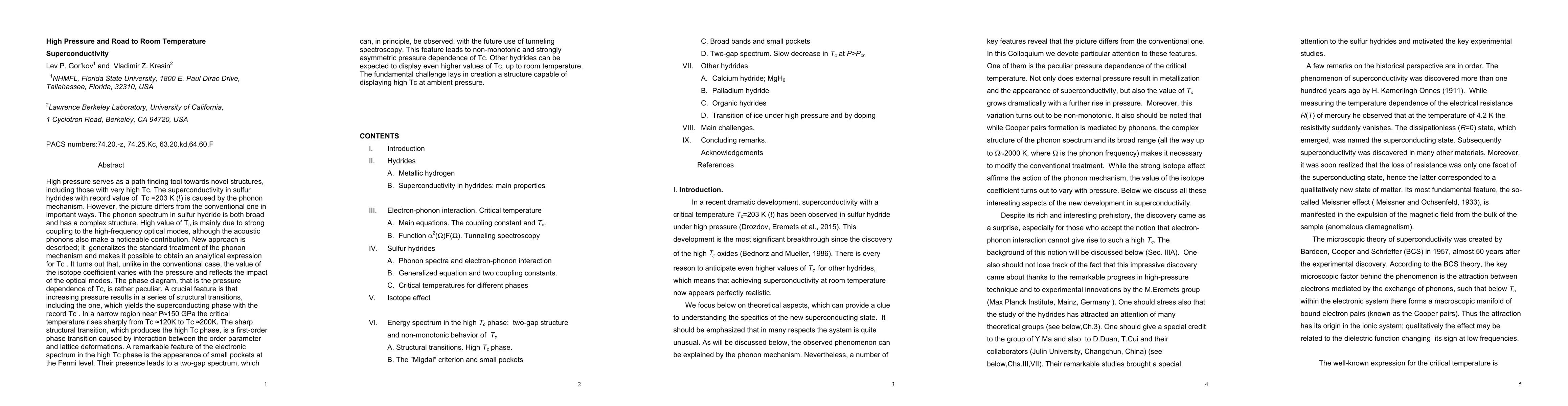 High pressure serves as a path finding tool towards novel structures, including those with very high Tc.The superconductivity in sulfur hydrides with record value (203 K) is caused by the phonon mechanism. However, the picture differs from the conventional one in important ways. The phonon spectrum in sulfur hydride is both broad and has a complex structure. High value of Tc is mainly due to strong coupling to the high-frequency optical modes, although the acoustic phonons also make a noticeable contribution. New approach is described;it generalizes the standard treatment of the phonon mechanism and makes it possible to obtain an analytical expression for Tc . It turns out that, unlike in the conventional case, the value of the isotope coefficient varies with the pressure and reflects the impact of the optical modes. The phase diagram, that is the pressure dependence of Tc, is rather peculiar. A crucial feature is that increasing pressure results in a series of structural transitions, including the one, which yields the superconducting phase with the record Tc.In a narrow region near 150GPa the critical temperature rises sharply from 120K to 200K. The sharp structural transition, which produces the high Tc phase, is a first-order phase transition caused by interaction between the order parameter and lattice deformations.Remarkable feature of the electronic spectrum in the high Tc phase is the appearance of small pockets at the Fermi level. Their presence leads to a two-gap spectrum, which can, in principle, be observed, with the future use of tunneling spectroscopy. This feature leads to non-monotonic and strongly asymmetric pressure dependence of Tc. Other hydrides can be expected to display even higher values of Tc, up to room temperature. The fundamental challenge lays in creation a structure capable of displaying high Tc at ambient pressure.