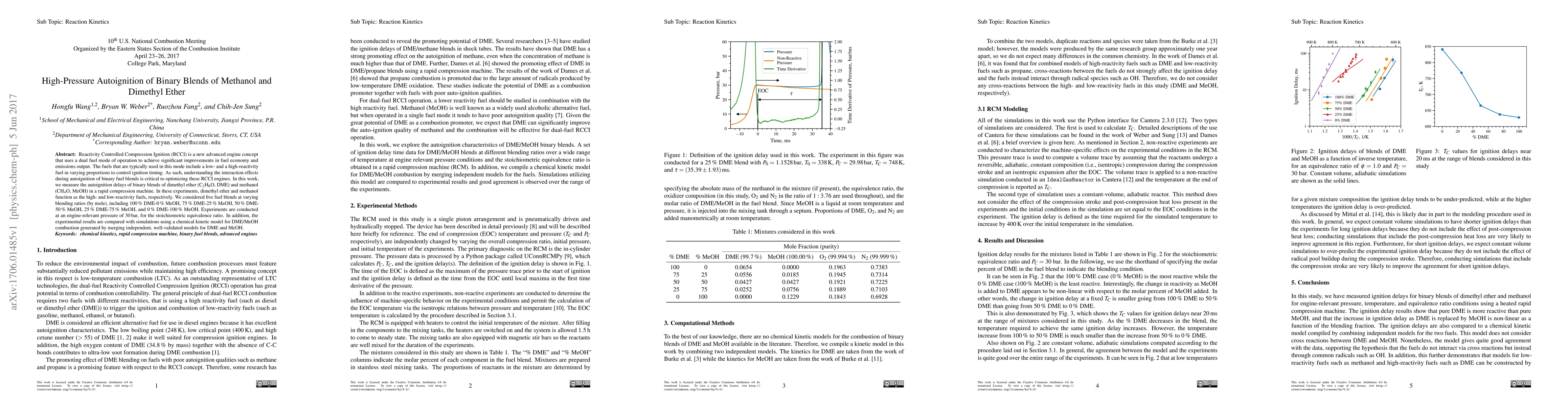 This study investigates the autoignition delays of binary blends of dimethyl ether and methanol under high-pressure conditions relevant to Reactivity Controlled Compression Ignition engines. The experiments reveal interaction effects between the high- and low-reactivity fuels, which are compared with simulations using a chemical kinetic model.