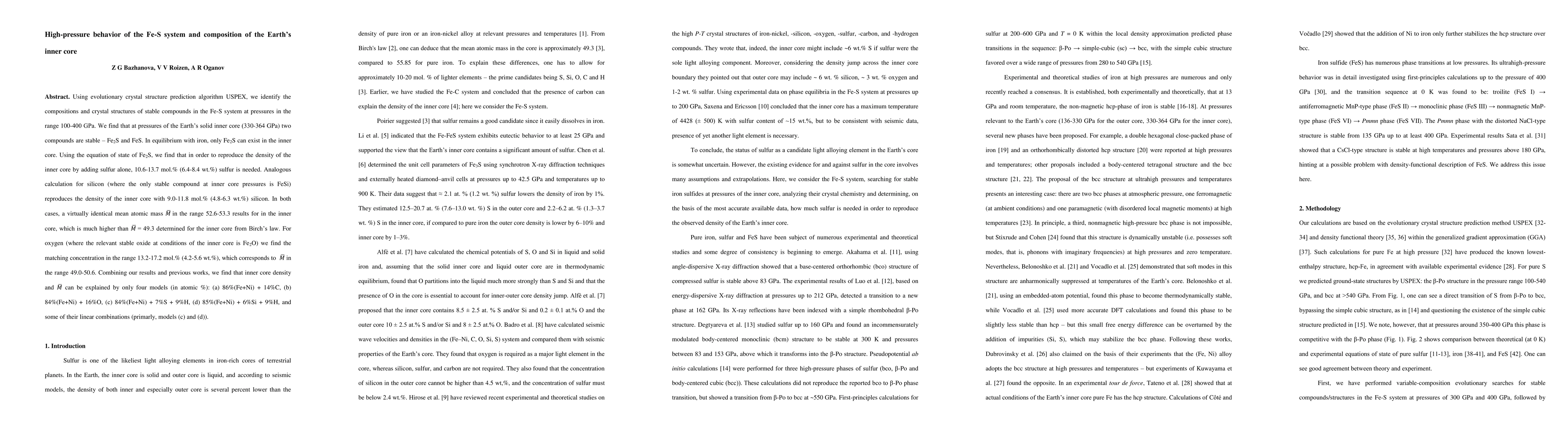 This paper uses USPEX to predict stable Fe-S compounds at inner core pressures, finding Fe2S and FeS as stable phases. It concludes that 10.6-13.7 mol.% sulfur is needed to match the inner core's density, suggesting four primary models to explain the inner core's composition, including carbon, oxygen, sulfur, hydrogen, and silicon.