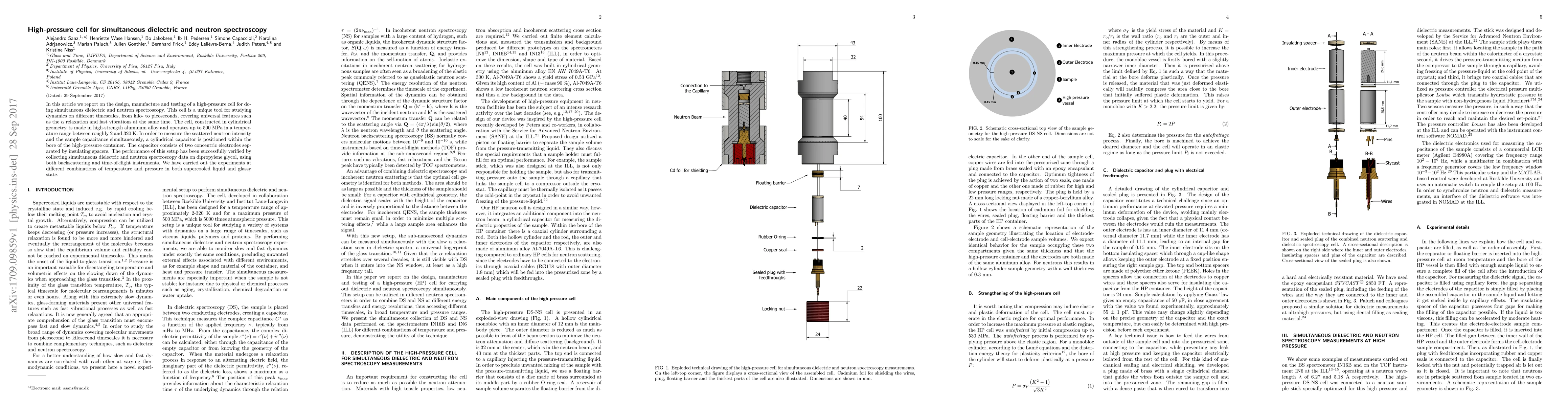 In this article we report on the design, manufacture and testing of a high-pressure cell for doing simultaneous dielectric and neutron spectroscopy. This cell is a unique tool for studying dynamics on different timescales, from kilo- to picoseconds, covering universal features such as the alpha relaxation and fast vibrations at the same time. The cell, constructed in cylindrical geometry, is made in high-strength aluminum alloy and operates up to 500 MPa in a temperature range between roughly 2 and 320 K. In order to measure the scattered neutron intensity and the sample capacitance simultaneously, a cylindrical capacitor is positioned within the bore of the high-pressure container. The capacitor consists of two concentric electrodes separated by insulating spacers. The performance of this setup has been successfully verified by collecting simultaneous dielectric and neutron spectroscopy data on dipropylene glycol, using both backscattering and time-of-flight instruments. We have carried out the experiments at different combinations of temperature and pressure in both supercooled liquid and glassy state.