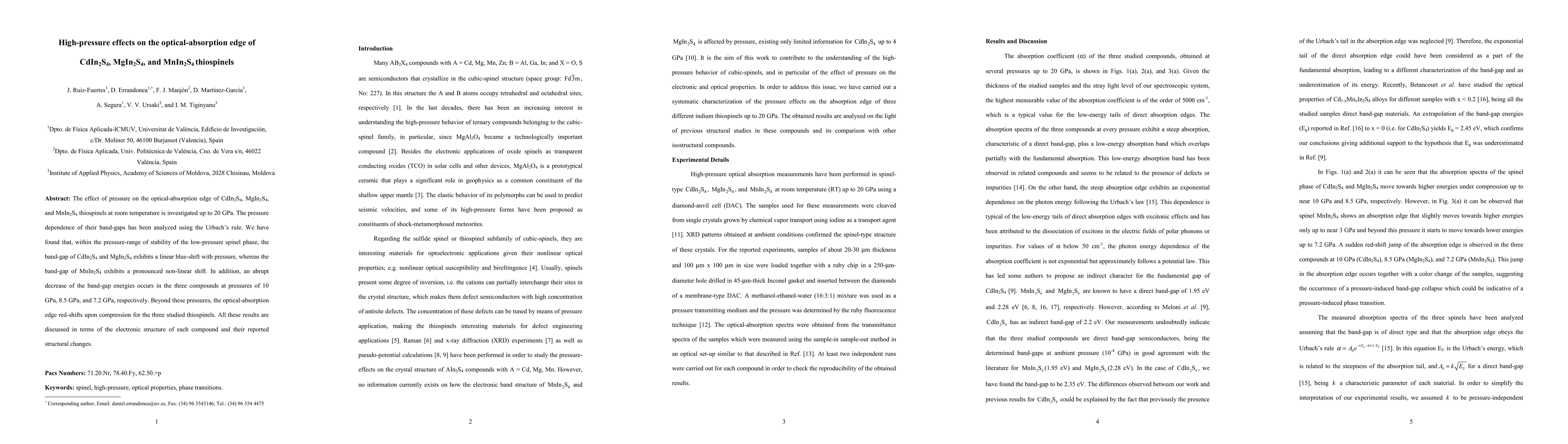 The effect of pressure on the optical-absorption edge of CdIn2S4, MgIn2S4, and MnIn2S4 thiospinels at room temperature is investigated up to 20 GPa. The pressure dependence of their band-gaps has been analyzed using the Urbach rule. We have found that, within the pressure-range of stability of the low-pressure spinel phase, the band-gap of CdIn2S4 and MgIn2S4 exhibits a linear blue-shift with pressure, whereas the band-gap of MnIn2S4 exhibits a pronounced non-linear shift. In addition, an abrupt decrease of the band-gap energies occurs in the three compounds at pressures of 10 GPa, 8.5 GPa, and 7.2 GPa, respectively. Beyond these pressures, the optical-absorption edge red-shifts upon compression for the three studied thiospinels. All these results are discussed in terms of the electronic structure of each compound and their reported structural changes.