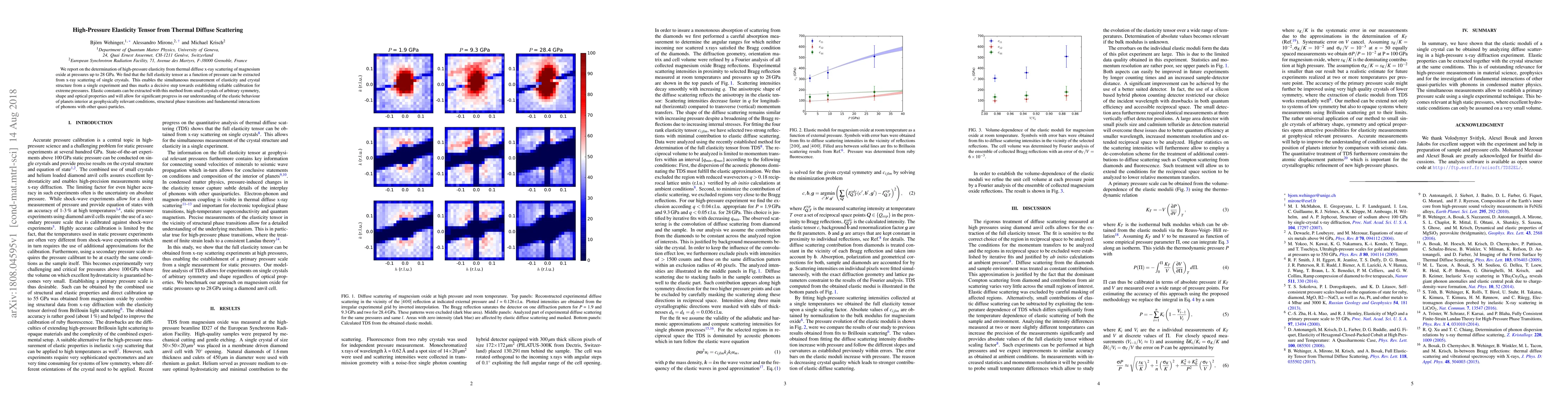 The research determines high-pressure elasticity from thermal diffuse x-ray scattering of magnesium oxide up to 28 GPa, extracting the full elasticity tensor from single crystals, enabling simultaneous measurement of elasticity and crystal structure from a single experiment.