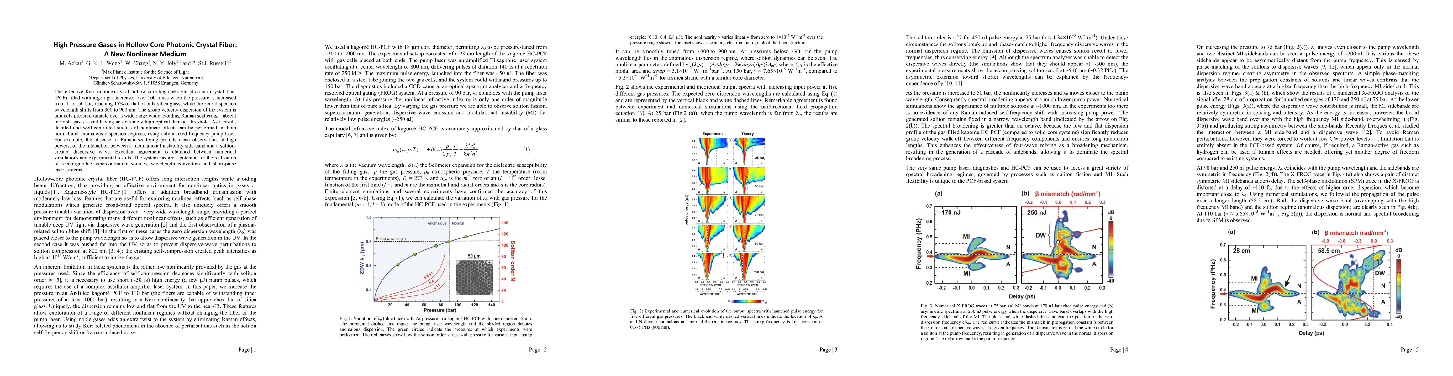 The effective Kerr nonlinearity of hollow-core kagome-style photonic crystal fiber (PCF) filled with argon gas increases over 100 times when the pressure is increased from 1 to 150 bar, reaching 15 % of that of bulk silica glass, while the zero dispersion wavelength shifts from 300 to 900 nm. The group velocity dispersion of the system is uniquely pressure-tunable over a wide range while avoiding Raman scattering : absent in noble gases and having an extremely high optical damage threshold. As a result, detailed and well controlled studies of nonlinear effects can be performed, in both normal and anomalous dispersion regimes, using only a fixed-frequency pump laser. For example, the absence of Raman scattering permits clean observation, at high powers, of the interaction between a modulational instability side-band and a soliton created dispersive wave. Excellent agreement is obtained between numerical simulations and experimental results. The system has great potential for the realisation of reconfigurable supercontinuum sources, wavelength convertors and short-pulse laser systems.