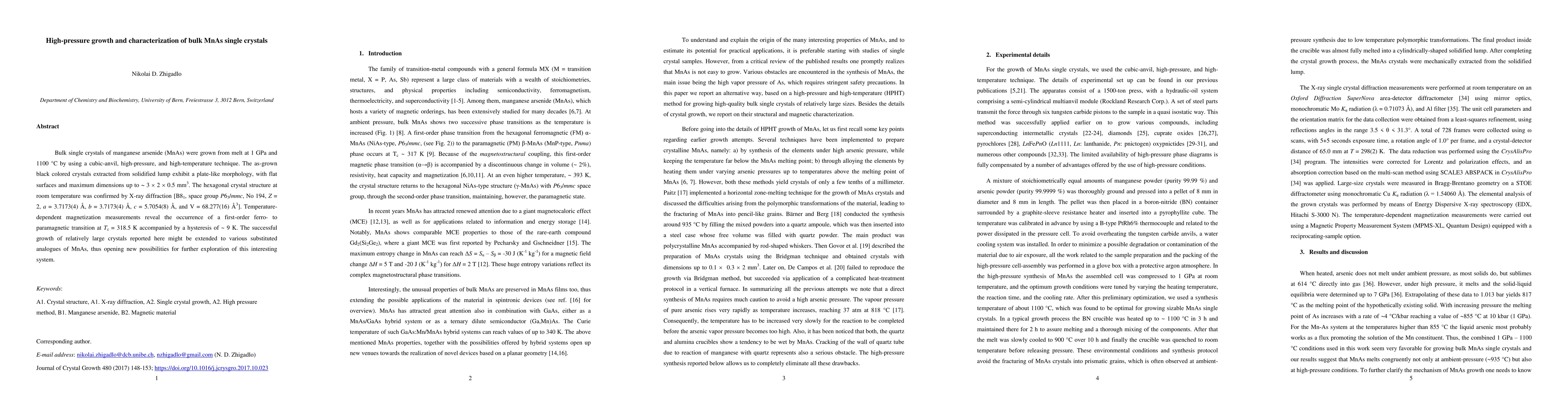 Bulk single crystals of manganese arsenide (MnAs) were grown from melt at 1 GPa and 1100 {\deg}C by using a cubic-anvil, high-pressure, and high-temperature technique. The as-grown black colored crystals extracted from solidified lump exhibit a plate-like morphology, with flat surfaces and maximum dimensions up to ~ 3 x 2 x 0.5 mm3. The hexagonal crystal structure at room temperature was confirmed by X-ray diffraction [B81, space group P63/mmc, No 194, Z = 2, a = 3.7173(4) {\AA}, b = 3.7173(4) {\AA}, c = 5.7054(8) {\AA}, and V = 68.277(16) {\AA}3]. Temperature-dependent magnetization measurements reveal the occurrence of a first-order ferro- to paramagnetic transition at Tc = 318.5 K accompanied by a hysteresis of ~ 9 K. The successful growth of relatively large crystals reported here might be extended to various substituted analogues of MnAs, thus opening new possibilities for further exploration of this interesting system.