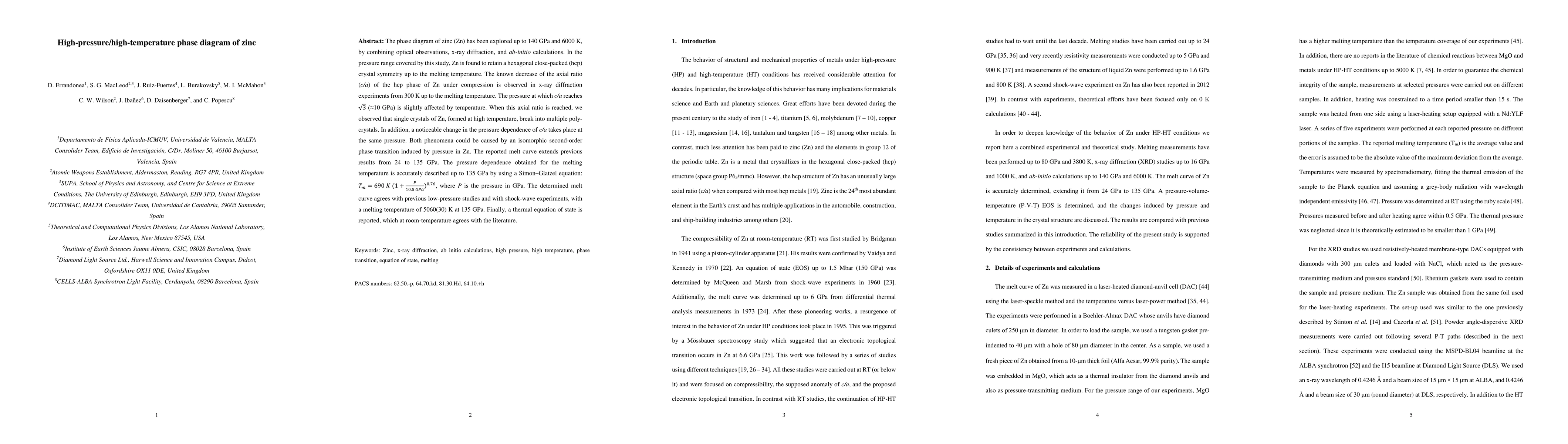 This study investigates the high-pressure and high-temperature phase behavior of zinc up to 140 GPa and 6000 K. Zinc maintains hexagonal close-packed symmetry up to its melting point, with a notable pressure-induced change in crystal structure around 10 GPa, potentially indicating a second-order phase transition.