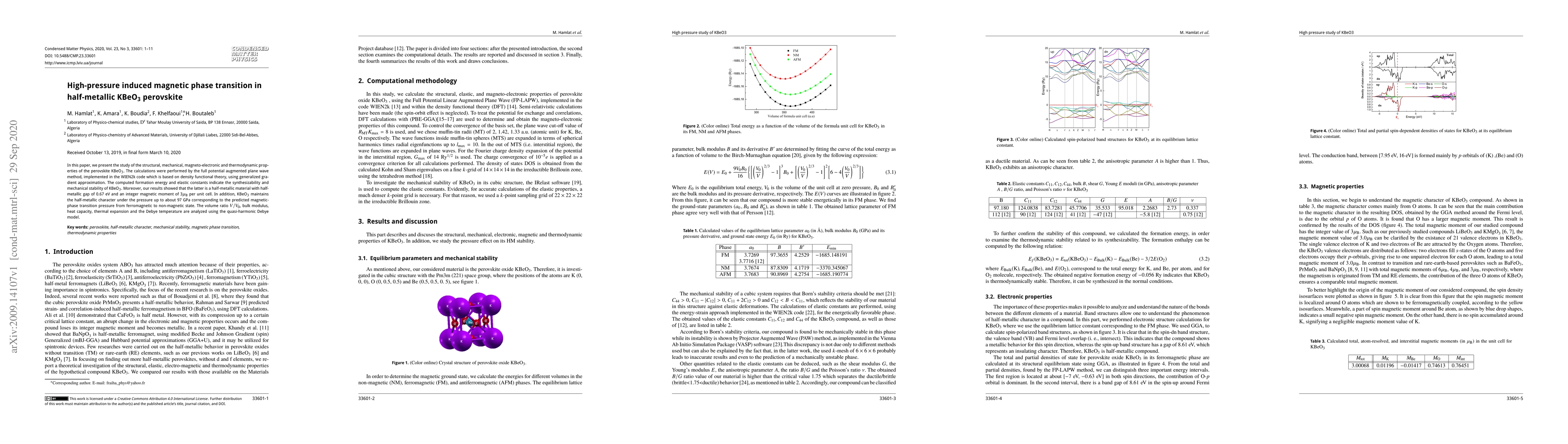 In this paper, we present the study of the structural, mechanical, magneto-electronic and thermodynamic properties of the perovskite KBeO$_3$. The calculations were performed by the full potential augmented plane wave method, implemented in the WIEN2k code which is based on density functional theory, using generalized gradient approximation. The computed formation energy and elastic constants indicate the synthesizability and mechanical stability of KBeO$_3$. Moreover, our results showed that the latter is a half-metallic material with half-metallic gap of 0.67 eV and an integer magnetic moment of 3$\mu_{\text{B}}$ per unit cell. In addition, KBeO$_3$ maintains the half-metallic character under the pressure up to about 97 GPa corresponding to the predicted magnetic-phase transition pressure from ferromagnetic to non-magnetic state. The volume ratio $V/V_{0}$, bulk modulus, heat capacity, thermal expansion and the Debye temperature are analyzed using the quasi-harmonic Debye model.