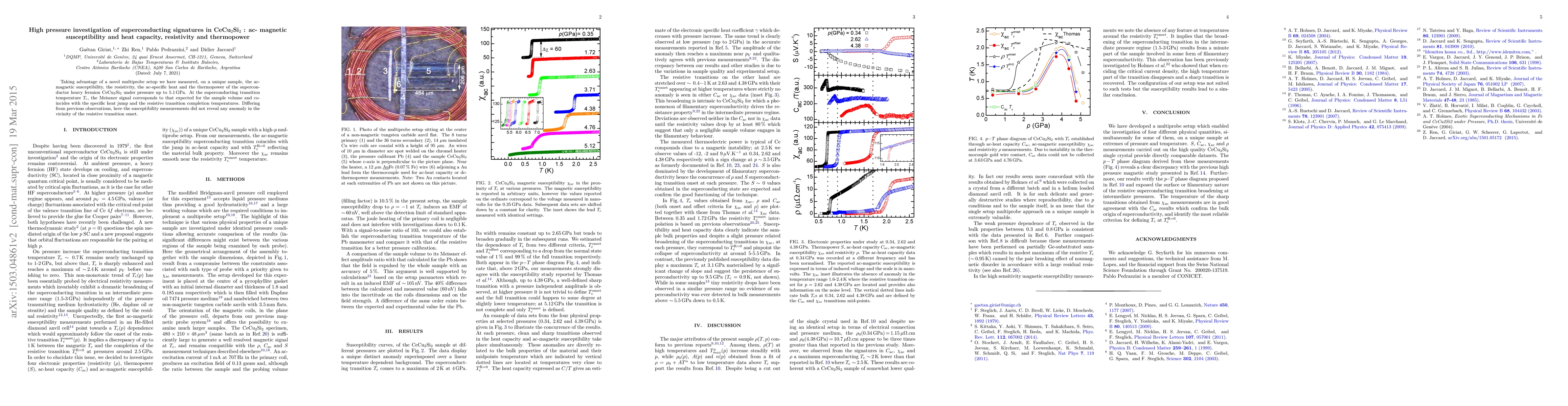 Taking advantage of a novel multiprobe setup we have measured, on a unique sample, the ac-magnetic susceptibility, the resistivity, the ac-specific heat and the thermopower of the superconductor heavy fermion CeCu$_{2}$Si$_{2}$ under pressure up to 5.1 GPa. At the superconducting transition temperature $T_c$, the Meissner signal corresponds to that expected for the sample volume and coincides with the specific heat jump and the resistive transition completion temperatures. Differing from previous observations, here the susceptibility measurements did not reveal any anomaly in the vicinity of the resistive transition onset.