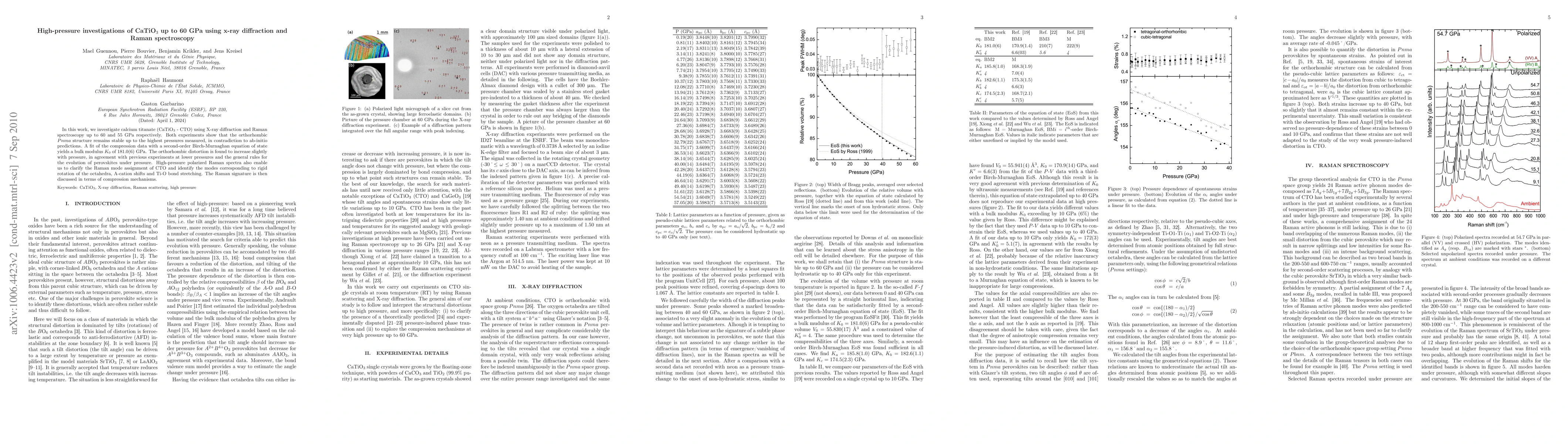 This study investigates calcium titanate (CaTiO3) under high pressures up to 60 GPa using X-ray diffraction and Raman spectroscopy, finding that its orthorhombic structure remains stable contrary to predictions. The material's bulk modulus is determined to be 181.0(6) GPa, and Raman spectra help clarify its mode assignments and compression mechanisms.