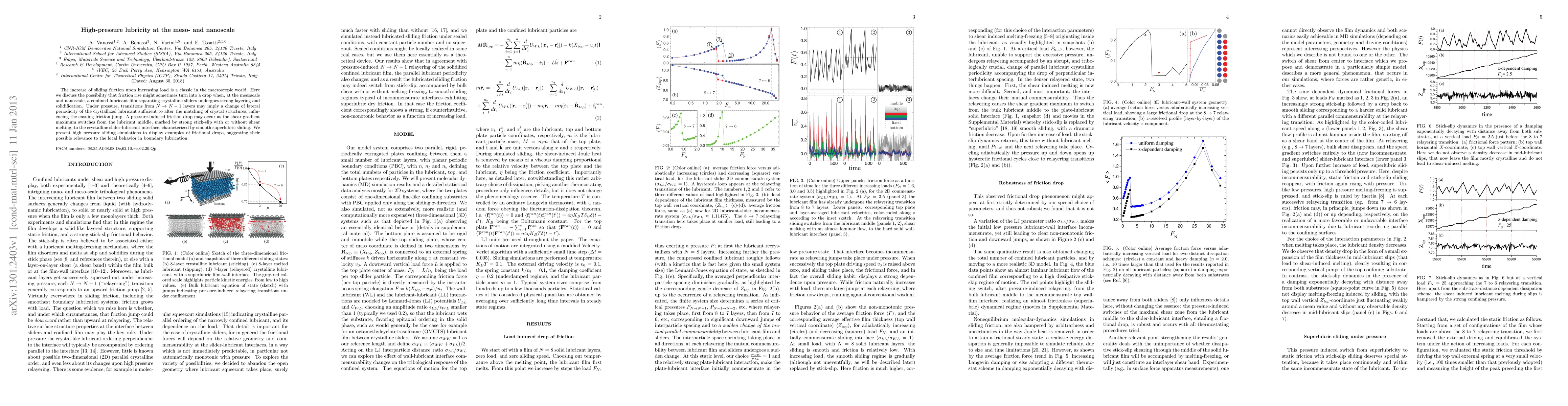 The increase of sliding friction upon increasing load is a classic in the macroscopic world. Here we discuss the possibility that friction rise might sometimes turn into a drop when, at the mesoscale and nanoscale, a confined lubricant film separating crystalline sliders undergoes strong layering and solidification. Under pressure, transitions from N to N-1 layers may imply a change of lateral periodicity of the crystallized lubricant sufficient to alter the matching of crystal structures, influencing the ensuing friction jump. A pressure-induced friction drop may occur as the shear gradient maximum switches from the lubricant middle, marked by strong stick-slip with or without shear melting, to the crystalline slider-lubricant interface, characterized by smooth superlubric sliding. We present high pressure sliding simulations to display examples of frictional drops, suggesting their possible relevance to the local behavior in boundary lubrication.