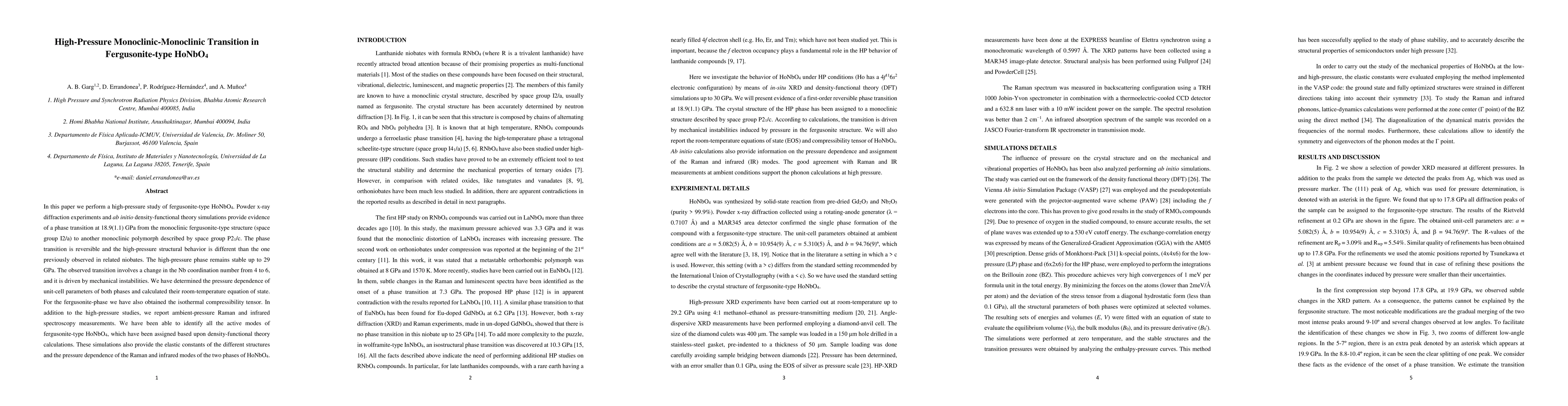 This study investigates the high-pressure behavior of fergusonite-type HoNbO4, revealing a reversible monoclinic-monoclinic phase transition at 18.9(1.1) GPa driven by mechanical instabilities, with the high-pressure phase stable up to 29 GPa. The transition involves a change in Nb coordination number from 4 to 6, and the structural properties and Raman/infrared modes were characterized using powder x-ray diffraction, ab initio simulations, and spectroscopy.