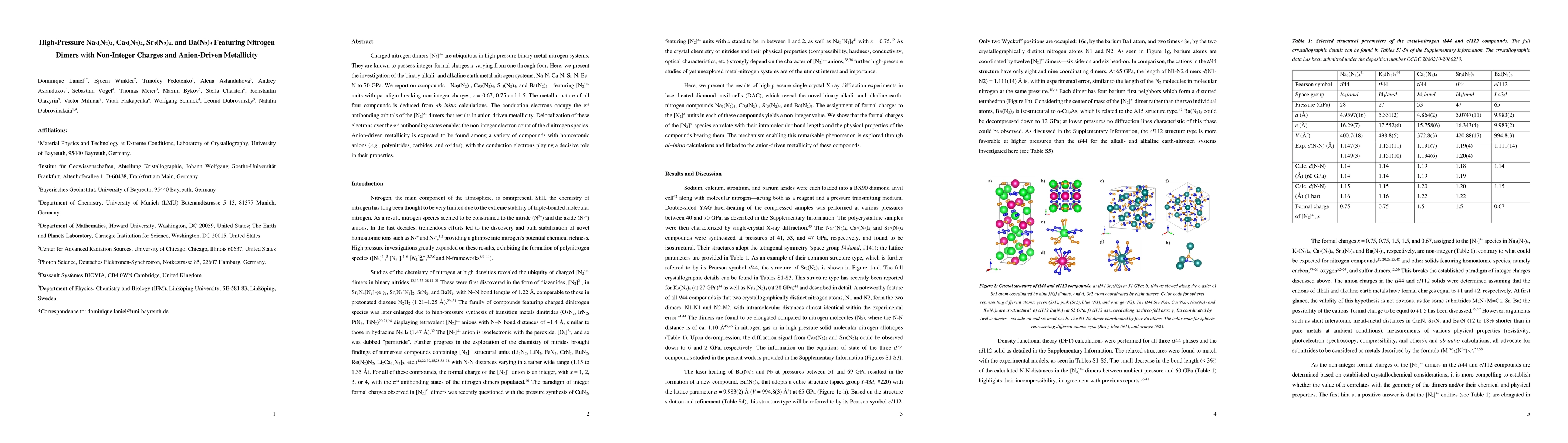 Charged nitrogen dimers are ubiquitous in high-pressure binary metal-nitrogen systems. They are known to possess integer formal charges x varying from one through four. Here, we present the investigation of the binary alkali- and alkaline earth metal-nitrogen systems, Na-N, Ca-N, Sr-N, Ba-N to 70 GPa. We report on compounds-Na3(N2)4, Ca3(N2)4, Sr3(N2)4, and Ba(N2)3-featuring charged nitrogen dimers with paradigm-breaking non-integer charges, x = 0.67, 0.75 and 1.5. The metallic nature of all four compounds is deduced from ab initio calculations. The conduction electrons occupy the pi* antibonding orbitals of the charged nitrogen dimers that results in anion-driven metallicity. Delocalization of these electrons over the pi* antibonding states enables the non-integer electron count of the dinitrogen species. Anion-driven metallicity is expected to be found among a variety of compounds with homoatomic anions (e.g., polynitrides, carbides, and oxides), with the conduction electrons playing a decisive role in their properties.