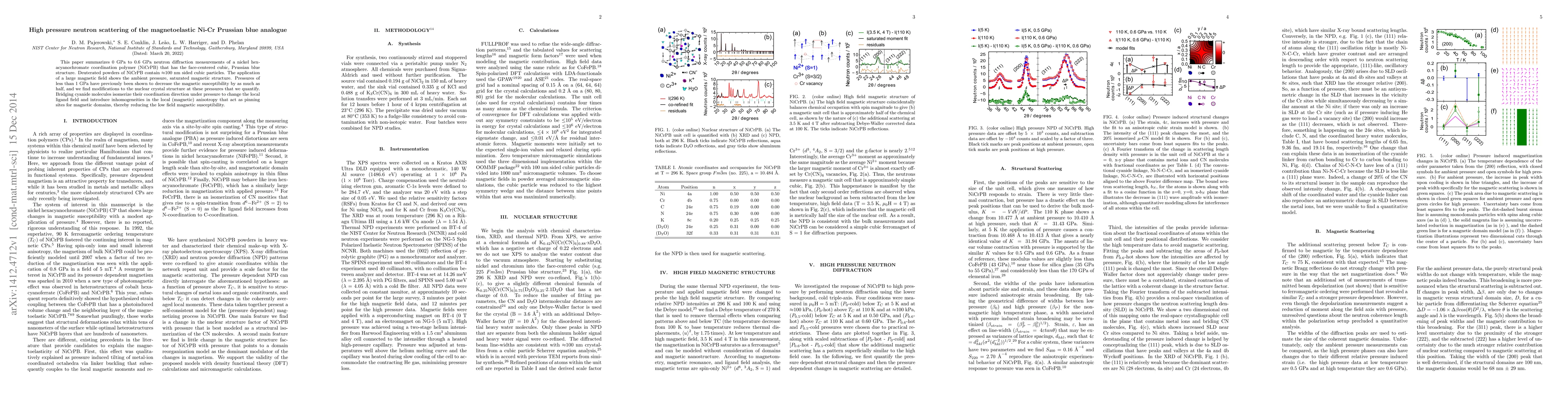 This paper summarizes 0 GPa to 0.6 GPa neutron diffraction measurements of a nickel hexacyanochromate coordination polymer (NiCrPB) that has the face-centered cubic, Prussian blue structure. Deuterated powders of NiCrPB contain ~100 nm sided cubic particles. The application of a large magnetic field shows the ambient pressure, saturated magnetic structure. Pressures of less than 1 GPa have previously been shown to decrease the magnetic susceptibility by as much as half, and we find modifications to the nuclear crystal structure at these pressures that we quantify. Bridging cyanide molecules isomerize their coordination direction under pressure to change the local ligand field and introduce inhomogeneities in the local (magnetic) anisotropy that act as pinning sites for magnetic domains, thereby reducing the low field magnetic susceptibility.