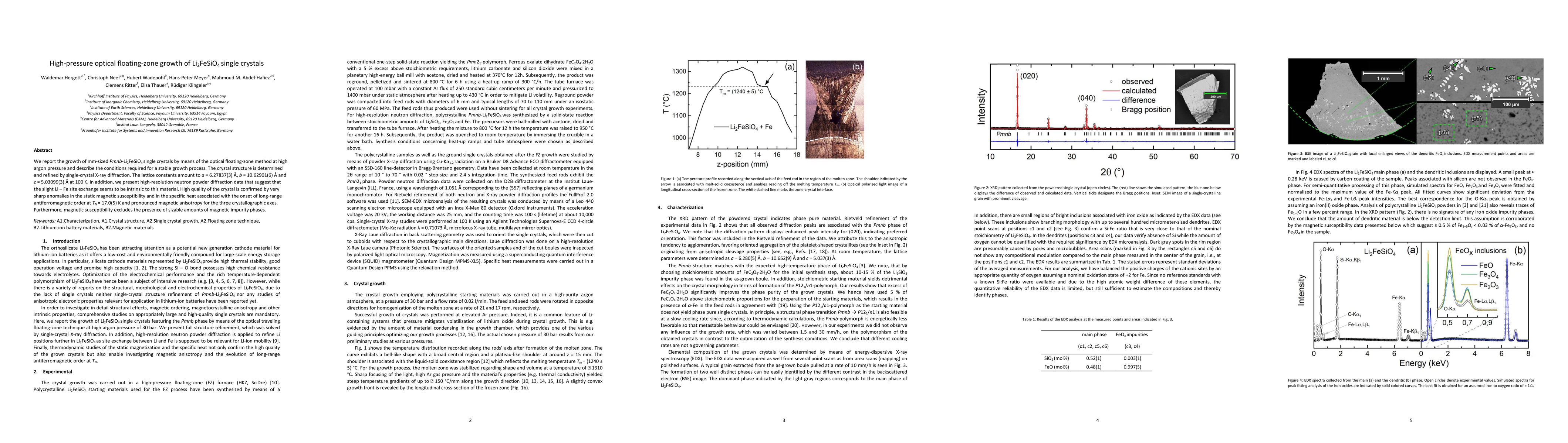 We report the growth of mm-sized Pmnb-Li2FeSiO4 single crystals by means of the optical floating-zone method at high argon pressure and describe the conditions required for a stable growth process. The crystal structure is determined and refined by single-crystal X-ray diffraction. The lattice constants amount to a = 6.27837(3) A, b = 10.62901(6) A and c = 5.03099(3) A at 100 K. In addition, we present high-resolution neutron powder diffraction data that suggest that the slight Li-Fe site exchange seems to be intrinsic to this material. High quality of the crystal is confirmed by very sharp anomalies in the static magnetic susceptibility and in the specific heat associated with the onset of long-range antiferromagnetic order at TN = 17.0(5) K and pronounced magnetic anisotropy for the three crystallographic axes. Furthermore, magnetic susceptibility excludes the presence of sizable amounts of magnetic impurity phases.