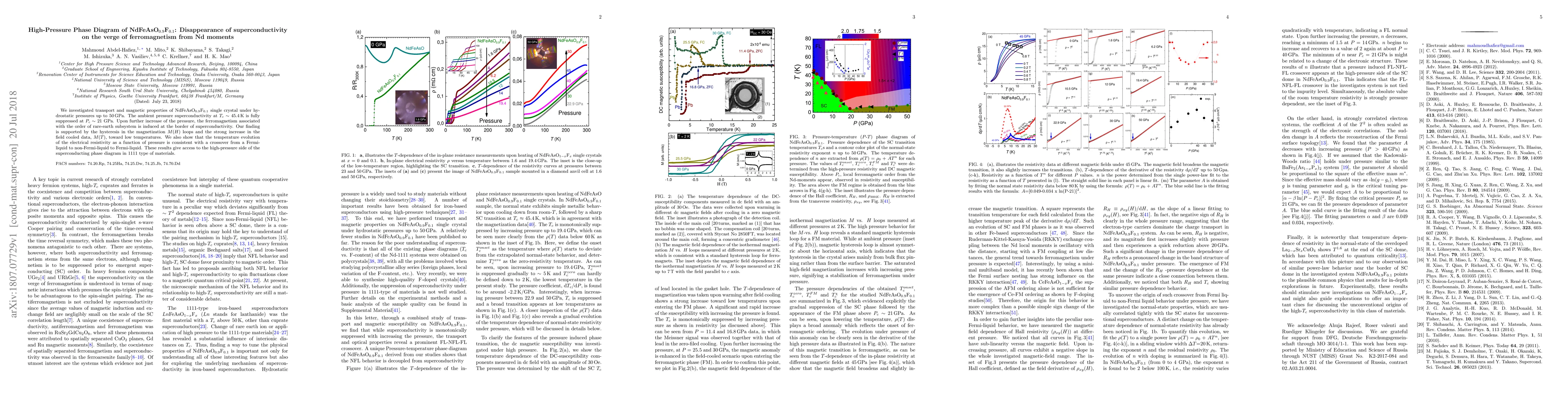 This study investigates the high-pressure phase diagram of NdFeAsO$_{0.9}$F$_{0.1}$ and finds that superconductivity is suppressed at 21 GPa, transitioning to ferromagnetism linked with rare-earth moments. The research reveals a complex evolution of electrical resistivity and supports the emergence of ferromagnetism through magnetic hysteresis.