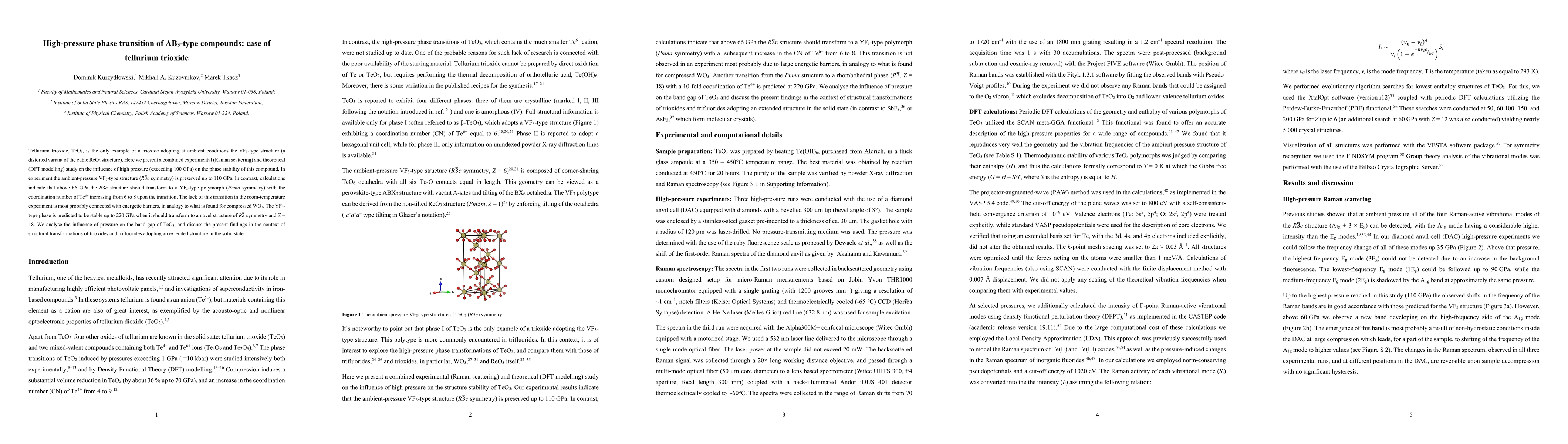 Tellurium trioxide, TeO3, is the only example of a trioxide adopting at ambient conditions the VF3-type structure (a distorted variant of the cubic ReO3 structure). Here we present a combined experimental (Raman scattering) and theoretical (DFT modelling) study on the influence of high pressure (exceeding 100 GPa) on the phase stability of this compound. In experiment the ambient-pressure VF3-type structure (R-3c symmetry) is preserved up to 110 GPa. In contrast, calculations indicate that above 66 GPa the R-3c structure should transform to a YF3-type polymorph (Pnma symmetry) with the coordination number of Te6+ increasing from 6 to 8 upon the transition. The lack of this transition in the room-temperature experiment is most probably connected with energetic barriers, in analogy to what is found for compressed WO3. The YF3-type phase is predicted to be stable up to 220 GPa when it should transform to a novel structure of R-3 symmetry and Z = 18. We analyse the influence of pressure on the band gap of TeO3, and discuss the present findings in the context of structural transformations of trioxides and trifluorides adopting an extended structure in the solid state