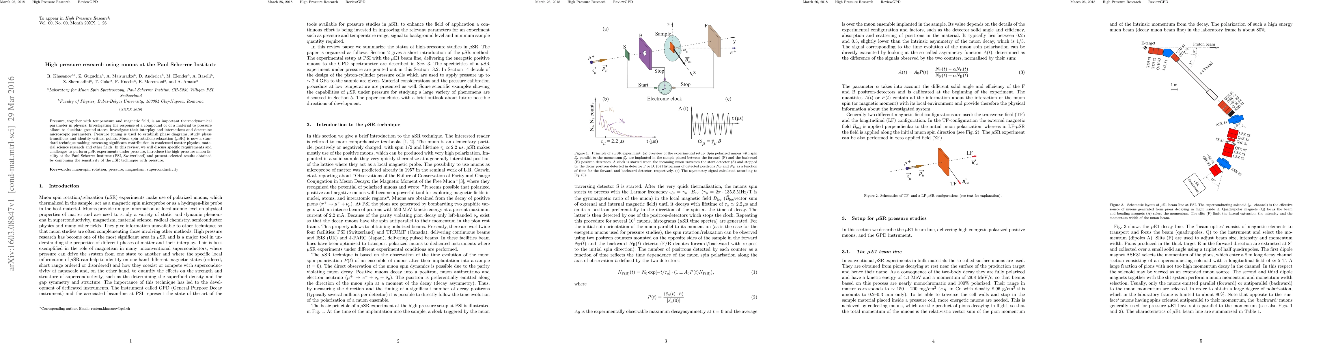 This paper reviews the use of muon spin rotation/relaxation (muSR) techniques at the Paul Scherrer Institute to investigate material responses under high pressure, highlighting the facility's capabilities and presenting selected results that elucidate ground states and phase transitions in compounds.
