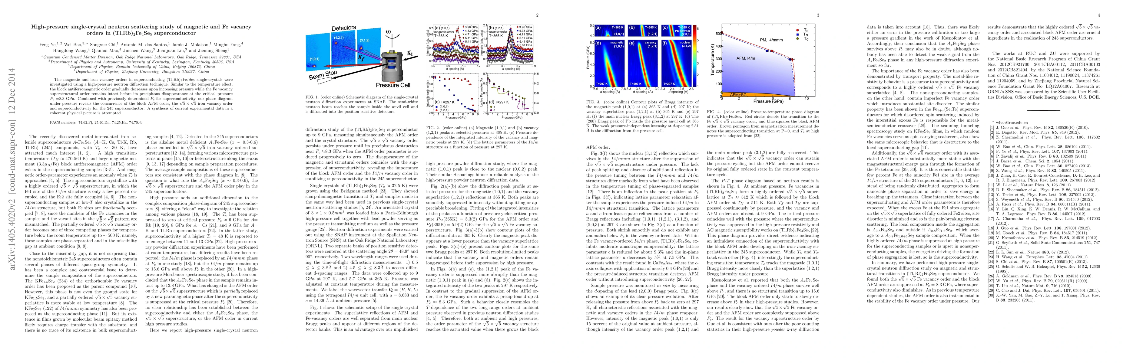 The magnetic and iron vacancy orders in superconducting (Tl,Rb)2Fe4Se5 single-crystals are investigated by using a high-pressure neutron diffraction technique. Similar to the temperature effect, the block antiferromagnetic order gradually decreases upon increasing pressure while the Fe vacancy superstructural order remains intact before its precipitous disappearance at the critical pressure Pc = 8.3 GPa. Combined with previously determined Pc for superconductivity, our phase diagram under pressure reveals the concurrence of the block AFM order, the iron vacancy order and superconductivity for the 245 superconductor. A synthesis of current experimental data in a coherent physical picture is attempted.