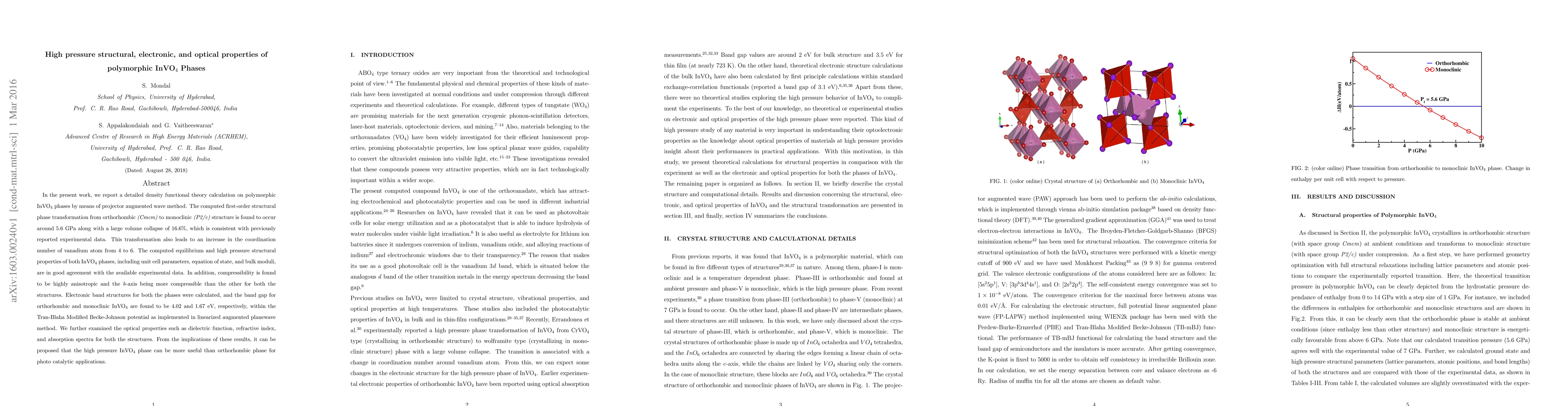 In the present work, we report a detailed density functional theory calculation on polymorphic InVO$_4$ phases by means of projector augmented wave method. The computed first-order structural phase transformation from orthorhombic \emph{(Cmcm)} to monoclinic \emph{(P2/c)} structure is found to occur around 5.6 GPa along with a large volume collapse of 16.6$\%$, which is consistent with previously reported experimental data. This transformation also leads to an increase in the coordination number of vanadium atom from 4 to 6. The computed equilibrium and high pressure structural properties of both InVO$_4$ phases, including unit cell parameters, equation of state, and bulk moduli, are in good agreement with the available experimental data. In addition, compressibility is found to be highly anisotropic and the \emph{b}-axis being more compressible than the other for both the structures. Electronic band structures for both the phases were calculated, and the band gap for orthorhombic and monoclinic InVO$_4$ are found to be 4.02 and 1.67 eV, respectively, within the Tran-Blaha Modified Becke-Johnson potential as implemented in linearized augmented planewave method. We further examined the optical properties such as dielectric function, refractive index, and absorption spectra for both the structures. From the implications of these results, it can be proposed that the high pressure InVO$_4$ phase can be more useful than orthorhombic phase for photo catalytic applications.