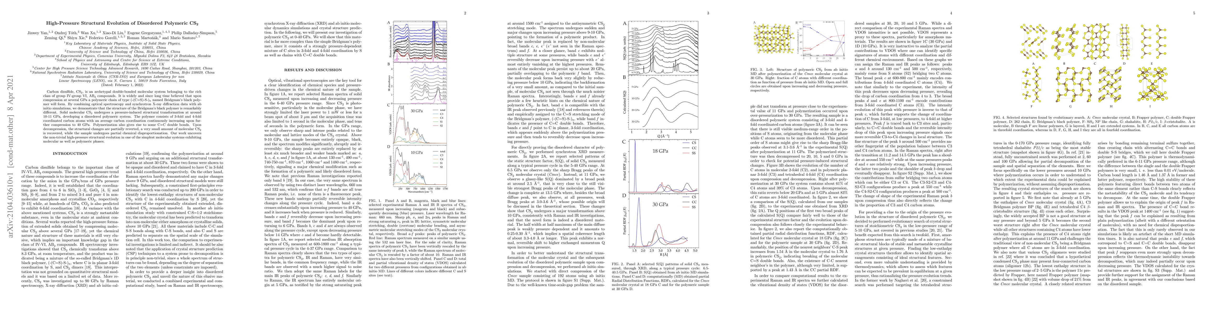 This research reveals that under high pressure, carbon disulfide (CS2) forms a disordered polymeric system rather than the previously believed Bridgman's black polymer. Using optical spectroscopy, synchrotron X-ray diffraction, and ab initio simulations, it's shown that CS2's structure evolves with increasing coordination of carbon atoms and some C=C double bond formation. Upon decompression, partial structural reversion and chemical disproportionation occur.