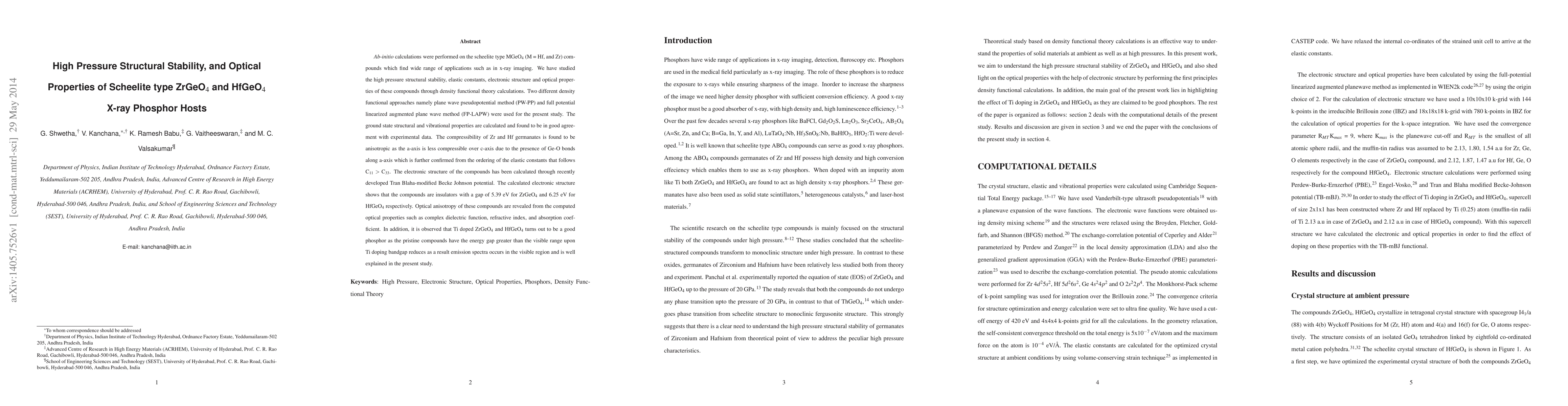 \emph{Ab-initio} calculations were performed on the scheelite type MGeO$_4$ (M = Hf, and Zr) compounds which find wide range of applications such as in x-ray imaging. We have studied the high pressure structural stability, elastic constants, electronic structure and optical properties of these compounds through density functional theory calculations. Two different density functional approaches namely plane wave pseudopotential method (PW-PP) and full potential linearized augmented plane wave method (FP-LAPW) were used for the present study. The ground state structural and vibrational properties are calculated and found to be in good agreement with experimental data. The compressibility of Zr and Hf germanates is found to be anisotropic as the a-axis is less compressible over c-axis due to the presence of Ge-O bonds along a-axis which is further confirmed from the ordering of the elastic constants that follows C$_{11}$ $>$ C$_{33}$. The electronic structure of the compounds has been calculated through recently developed Tran Blaha-modified Becke Johnson potential. The calculated electronic structure shows that the compounds are insulators with a gap of 5.39 eV for ZrGeO$_4$ and 6.25 eV for HfGeO$_4$ respectively. Optical anisotropy of these compounds are revealed from the computed optical properties such as complex dielectric function, refractive index, and absorption coefficient. In addition, it is observed that Ti doped ZrGeO$_4$ and HfGeO$_4$ turns out to be a good phosphor as the pristine compounds have the energy gap greater than the visible range upon Ti doping bandgap reduces as a result emission spectra occurs in the visible region and is well explained in the present study.