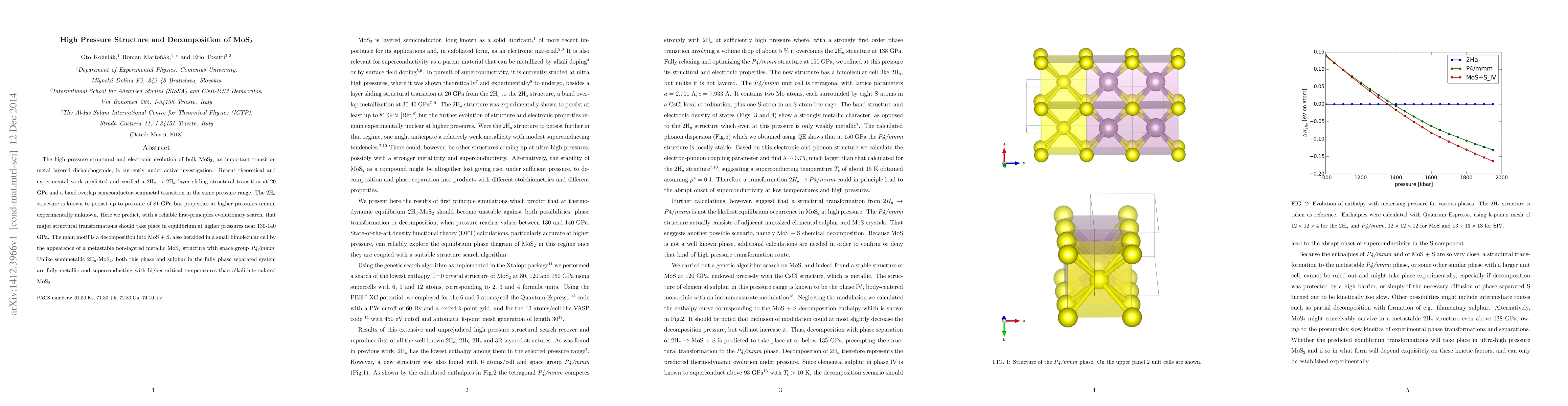 This paper reports on the high-pressure structural transformations in bulk MoS$_2$, predicting a transition to a metallic phase and decomposition into MoS and S near 130-140 GPa, with both the decomposed components exhibiting superconductivity at higher critical temperatures than previously known phases.