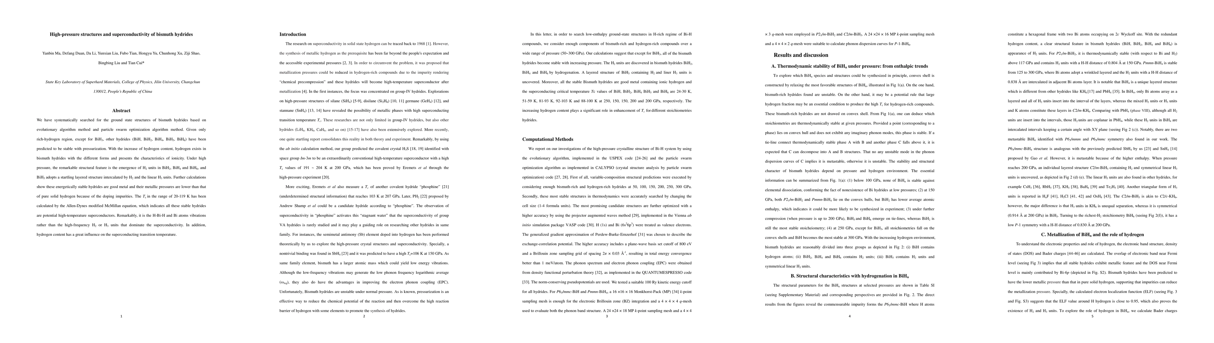 We have systematically searched for the ground state structures of bismuth hydrides based on evolutionary algorithm method and particle swarm optimization algorithm method. Given only rich-hydrogen region, except for BiH$_{3}$, other hydrides (BiH, BiH$_{2}$, BiH$_{4}$, BiH$_{5}$, BiH$_{6}$) have been predicted to be stable with pressurization. With the increase of hydrogen content, hydrogen exists in bismuth hydrides with the different forms and presents the characteristics of ionicity. Under high pressure, the remarkable structural feature is the emergence of H$_{2}$ units in BiH$_{2}$, BiH$_{4}$ and BiH$_{6}$, and BiH$_{6}$ adopts a startling layered structure intercalated by H$_{2}$ and the linear H$_{3}$ units. Further calculations show these energetically stable hydrides are good metal and their metallic pressures are lower than that of pure solid hydrogen because of the doping impurities. The $T_{c}$ in the range of 20-119 K has been calculated by the Allen-Dynes modified McMillan equation, which indicates all these stable hydrides are potential high-temperature superconductors. Remarkably, it is the H-Bi-H and Bi atoms vibrations rather than the high-frequency H$_{2}$ or H$_{3}$ units that dominate the superconductivity. In addition, hydrogen content has a great influence on the superconducting transition temperature.