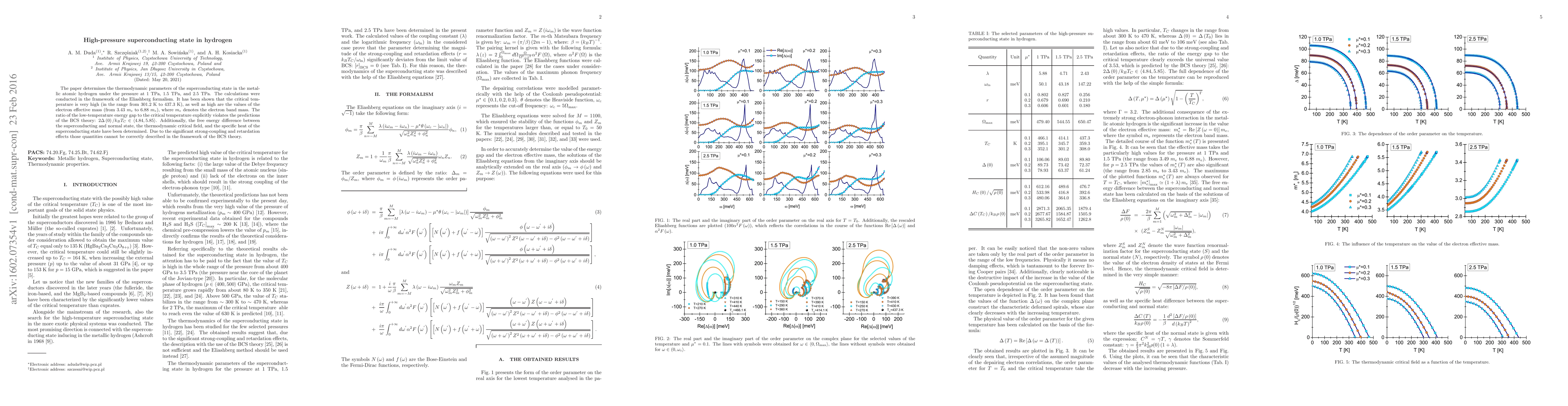 The paper determines the thermodynamic parameters of the superconducting state in the metallic atomic hydrogen under the pressure at $1$ TPa, $1.5$ TPa, and $2.5$ TPa. The calculations were conducted in the framework of the Eliashberg formalism. It has been shown that the critical temperature is very high (in the range from $301.2$ K to $437.3$ K), as well as high are the values of the electron effective mass (from $3.43$ $m_{e}$ to $6.88$ $m_{e}$), where $m_{e}$ denotes the electron band mass. The ratio of the low-temperature energy gap to the critical temperature explicitly violates the predictions of the BCS theory: $2\Delta\left(0\right)/k_{B}T_{C}\in\left<4.84,5.85\right>$. Additionally, the free energy difference between the superconducting and normal state, the thermodynamic critical field, and the specific heat of the superconducting state have been determined. Due to the significant strong-coupling and retardation effects those quantities cannot be correctly described in the framework of the BCS theory.