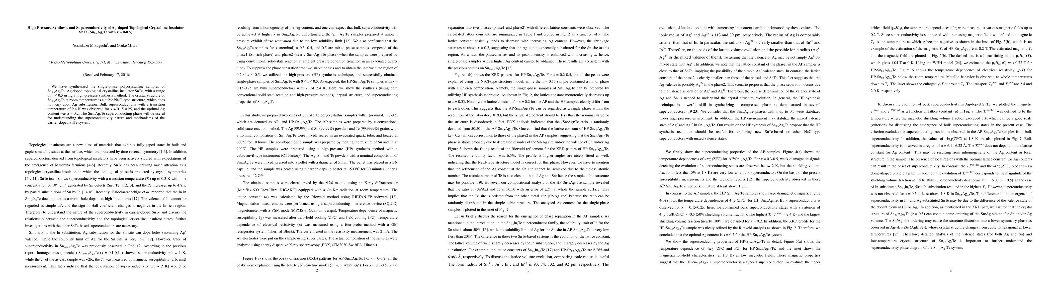 This study synthesizes Ag-doped SnTe using high-pressure methods, revealing a cubic NaCl-type structure unaffected by doping. Superconductivity emerges in the range x = 0.15-0.25, with optimal performance at x = 0.2, indicating a transition temperature of 2.4 K.