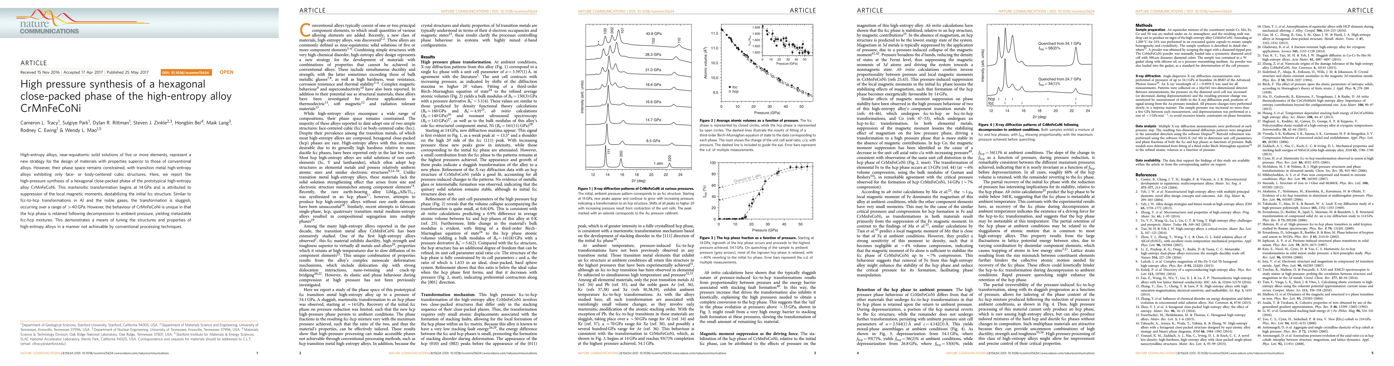 This study reports the high-pressure synthesis of a hexagonal close-packed phase in the high-entropy alloy CrMnFeCoNi, achieved through a martensitic transformation starting at 14 GPa. The hcp phase is retained upon decompression, yielding metastable mixtures, showcasing a novel method for altering the structures and properties of high-entropy alloys.