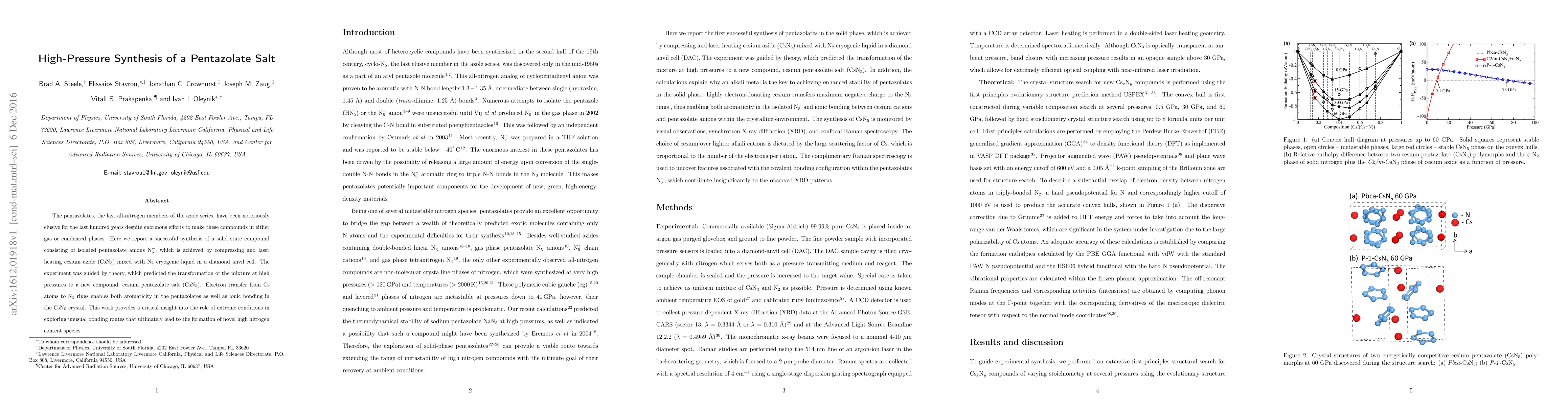 Researchers successfully synthesized a pentazolate salt, an elusive all-nitrogen compound, by compressing and laser-heating cesium azide mixed with N2 in a diamond anvil cell. The study demonstrates the role of extreme conditions in creating novel high nitrogen content species.