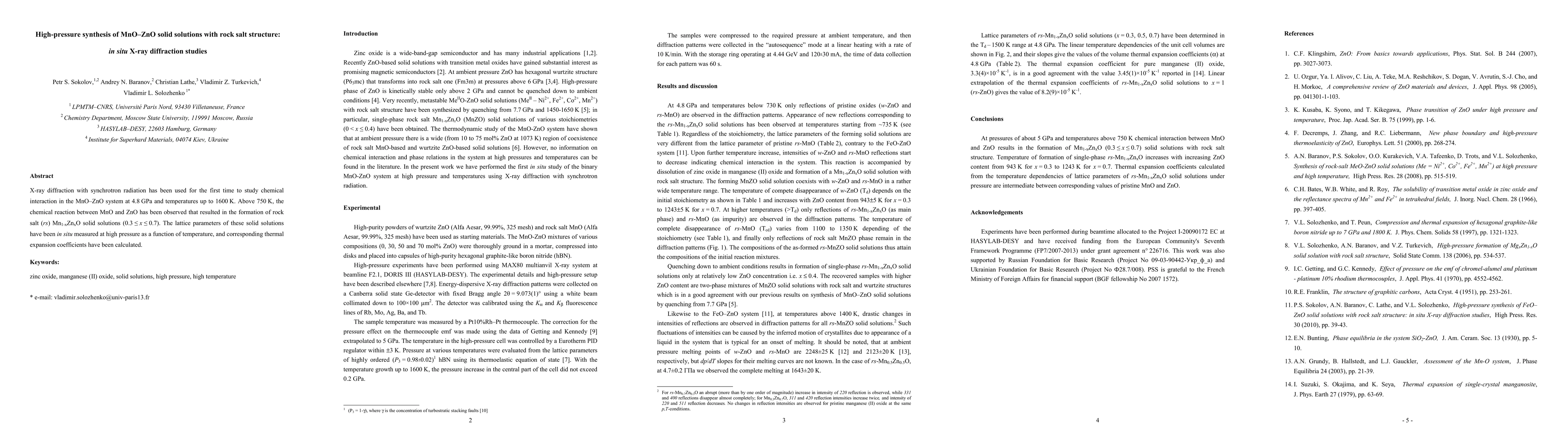 This study utilized synchrotron X-ray diffraction to observe the formation of rock salt Mn1-xZnxO solid solutions (0.3 ≤ x ≤ 0.7) in the MnO-ZnO system at high pressure and temperatures up to 1600 K, revealing thermal expansion coefficients through in situ lattice parameter measurements.